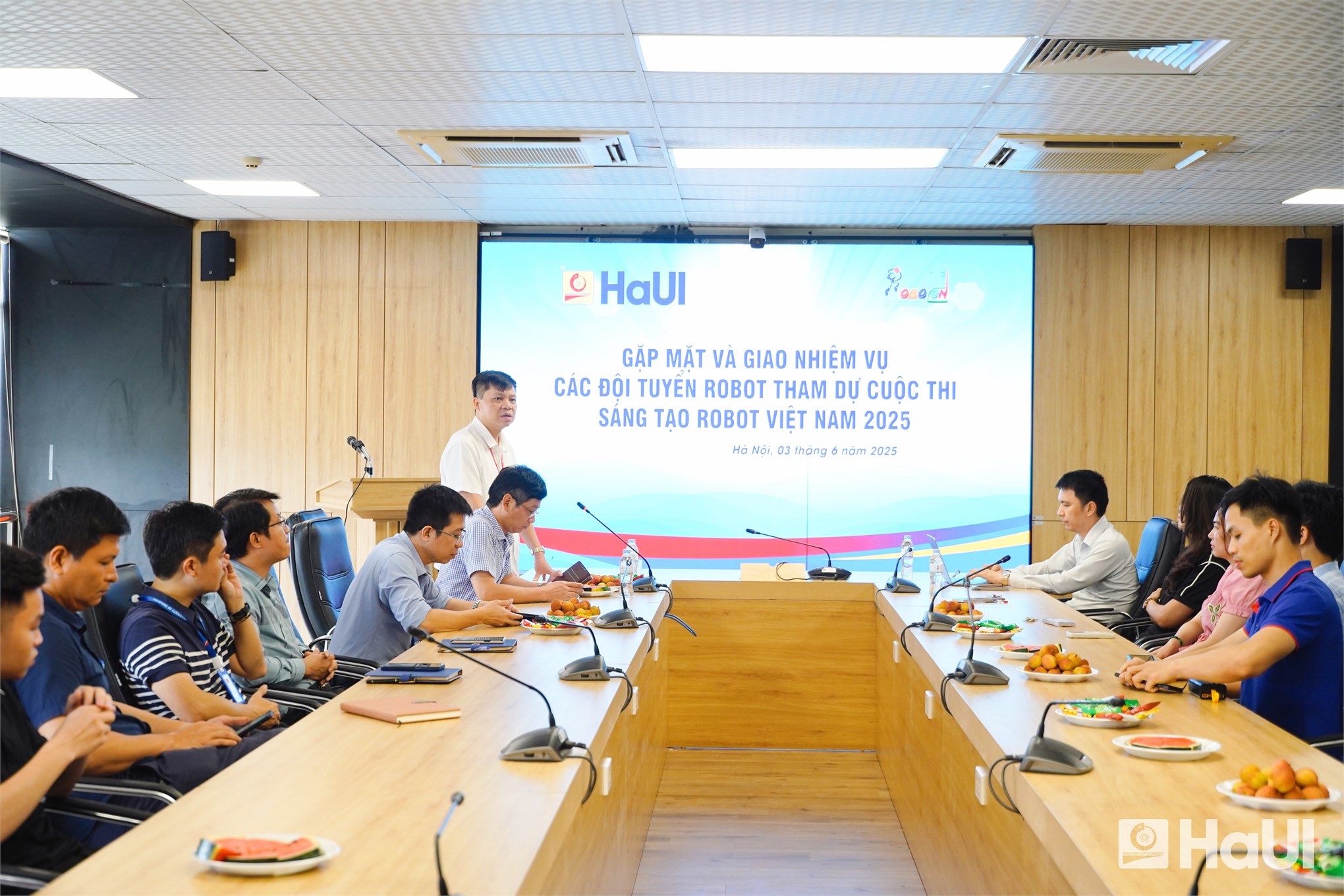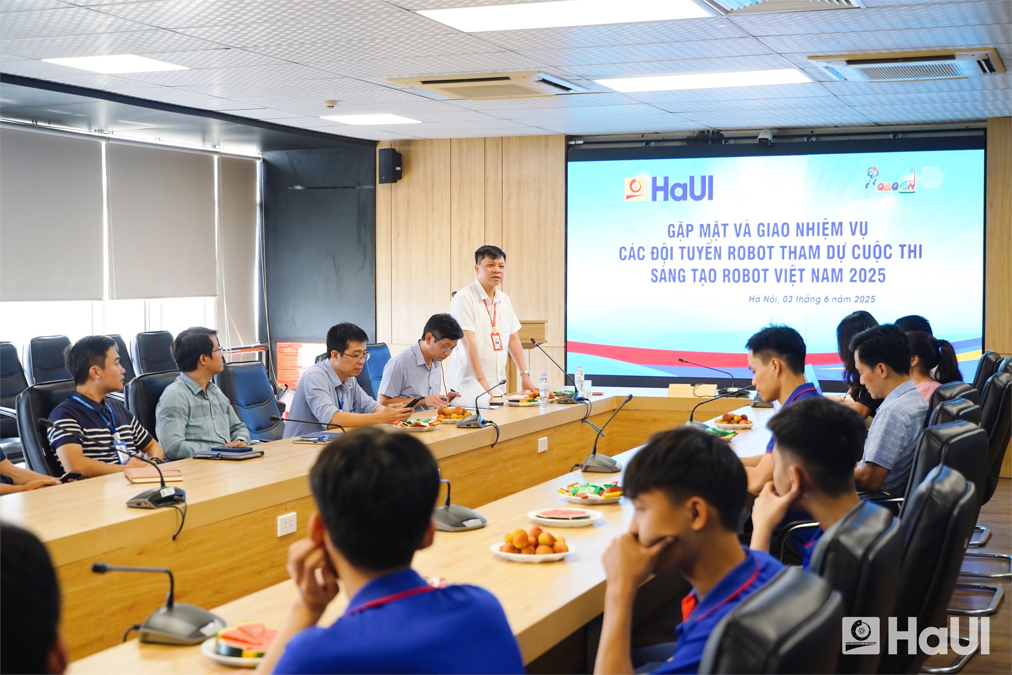 On the afternoon of June 03, 2025, Hanoi University of Industry held an intimate meeting to encourage and formally assign tasks to the university's five outstanding Robocon teams. These teams will officially represent HaUI at Robocon Vietnam 2025, taking place in Ninh Binh from June 04 to June 13, 2025. The meeting, filled with enthusiasm and confidence in the younger generation, underscored the leadership's profound interest in this prestigious intellectual arena.