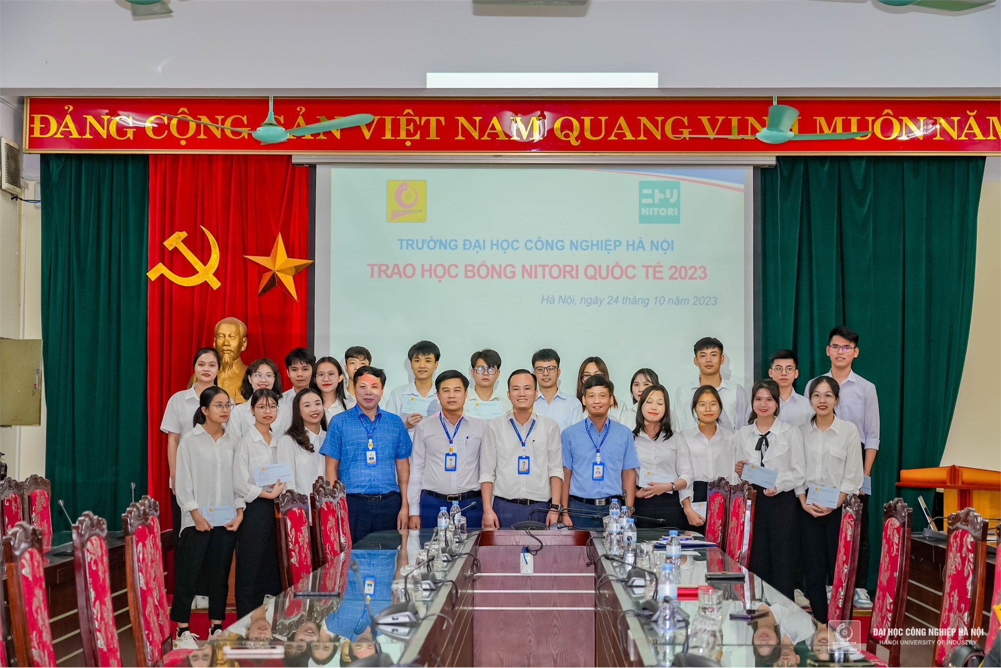 On the afternoon of October 24, Hanoi University of Industry held a ceremony to award the Nitori International Scholarships 2023 to 20 outstanding students majoring in Chemistry, Electrical and Electronics Engineering, Computer Engineering, Electro-Mechanical Engineering, Business Management, and Accounting. Each scholarship is valued at 13 million VND.
