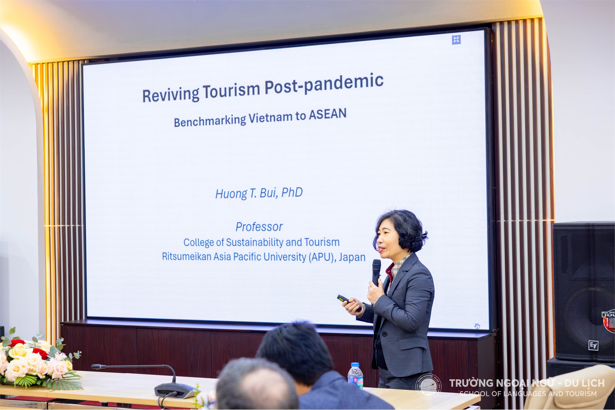 Prof. Dr. Bui Thanh Huong, from Ritsumeikan Asia Pacific University (Japan), delivered a compelling keynote on “Reviving Tourism in Post-Pandemic: Benchmarking Vietnam against ASEAN.” She analyzed Vietnam’s tourism recovery and urged the country to leverage domestic tourism potential, develop the blue economy, and enhance infrastructure and digital transformation to keep pace with ASEAN 5+ nations.