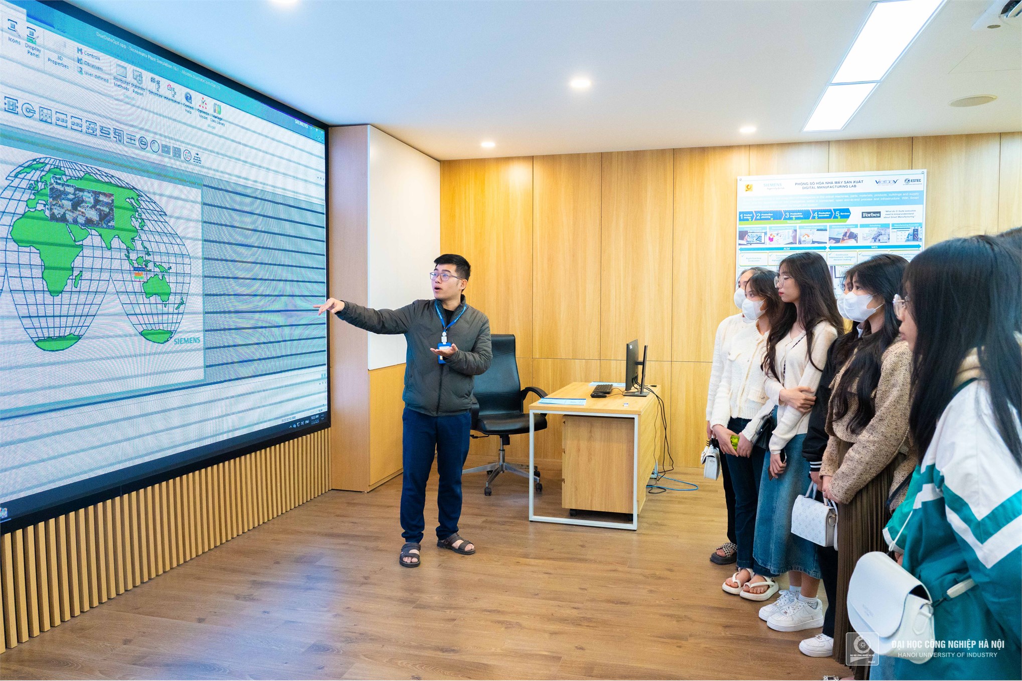 The group of students from class 12A3 listened to the introduction about the Smart Factory Research Center, School of Mechanical and Automotive Engineering (under Hanoi University of Industry)