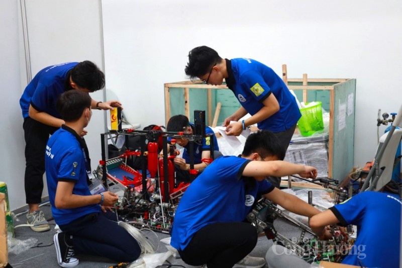 | Thành viên DCN-ĐT02 lắp ráp robot trước giờ test thử (Ảnh: Minh Chiến) |