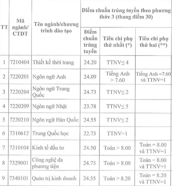 29 | 7220201 | Ngôn ngữ Anh | 25.89 | Ngoại ngữ > 9.2 | Ngoại ngữ = 9.2 và NV≤ 1 |
