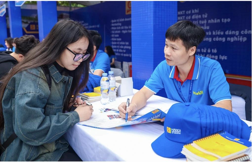 Học sinh tìm hiểu phương thức tuyển sinh đại học của Trường Đại học Công nghiệp Hà Nội (Ảnh: Ngô Huy).