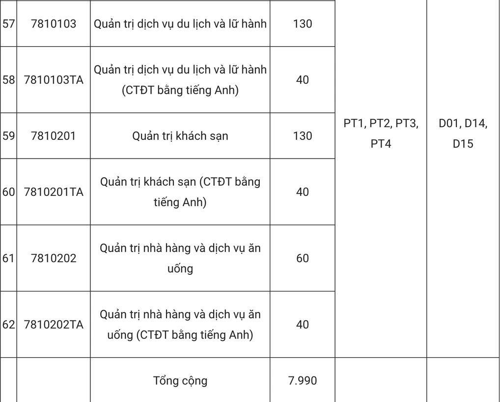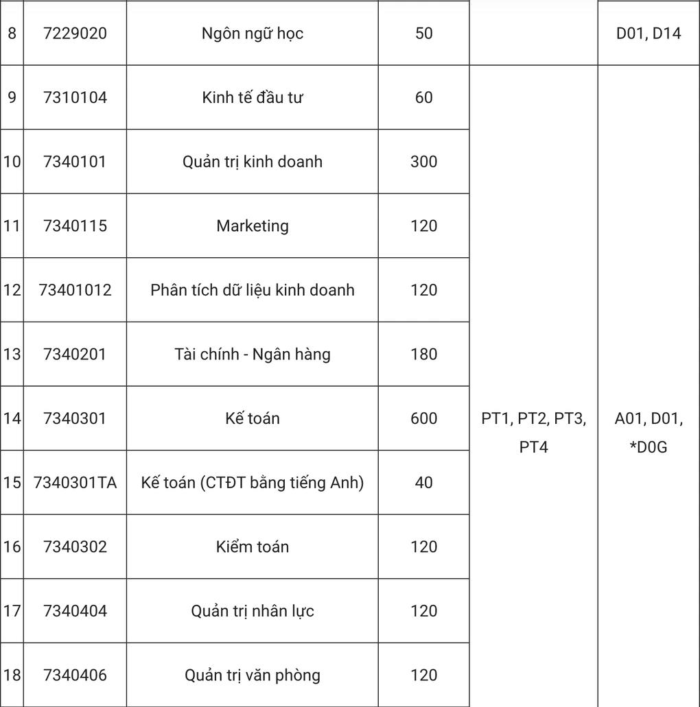 Chỉ tiêu, phương thức tuyển sinh và tổ hợp xét tuyển dự kiến của từng ngành như sau: