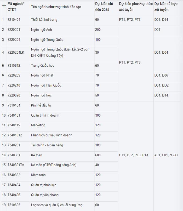 Thông tin chi tiết sẽ được công bố trong Đề án tuyển sinh đại học năm 2025 (dự kiến trước ngày 15/3/2025).