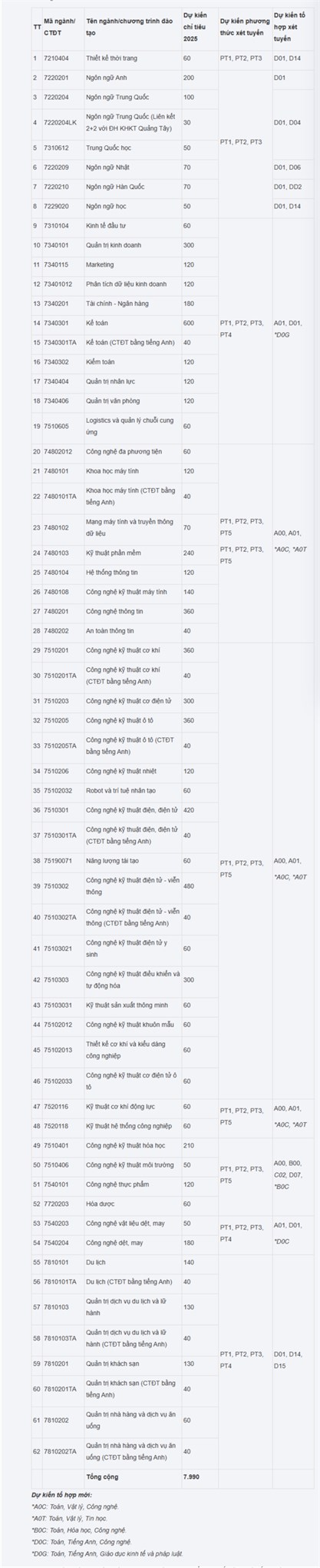 - Phương thức 3 (PT3): Xét tuyển dựa trên kết quả thi tốt nghiệp THPT năm 2025 (chỉ tiêu dự kiến 80%).