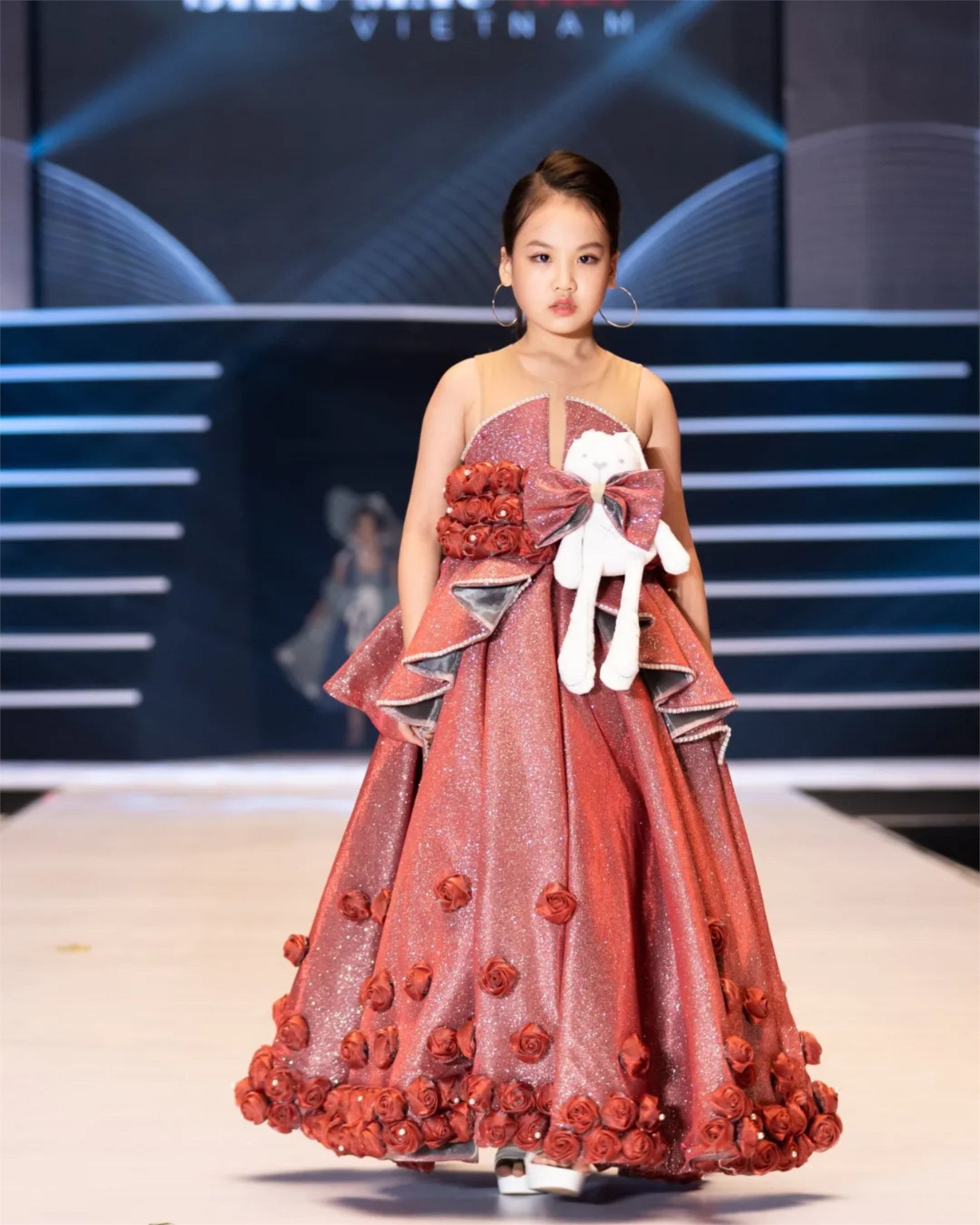 Thu Phương bộc bạch: BST được thiết kế lại từ BST "Bling Bling" của NTK Đắc Ngọc, với một chút thay đổi kết cấu và tạo điểm nhấn là hoa hồng và những chú gấu đáng yêu, em hi vọng vẫn giữ được nét hồn nhiên, gần gũi với các bạn nhỏ.