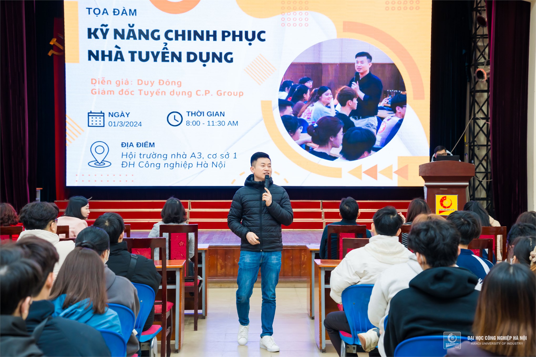 Tại buổi tọa đàm, ông Ngô Văn Đông - Giám đốc tuyển dụng nhân sự Công ty Cổ phần chăn nuôi C.P Việt Nam chia sẻ đến sinh viên những nội dung hấp dẫn như: Định vị bản thân trong thị trường lao động; Xác định bản chất của buổi phỏng vấn; Tìm kiếm nguồn thông tin tuyển dụng hiệu quả; Hướng dẫn các tương tác trên mạng xã hội, cách viết Email xin việc ấn tượng; kỹ năng phỏng vấn hiệu quả,…