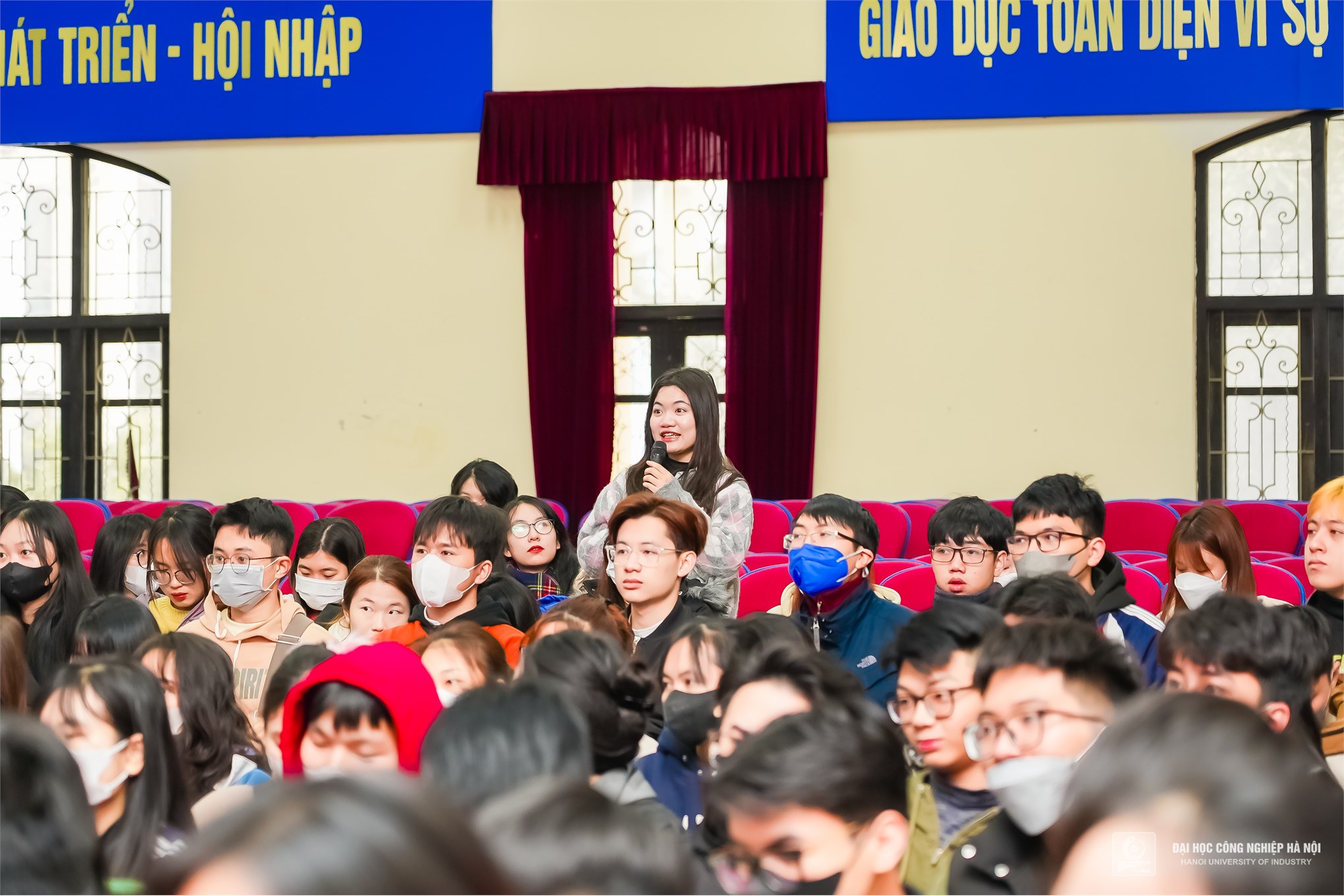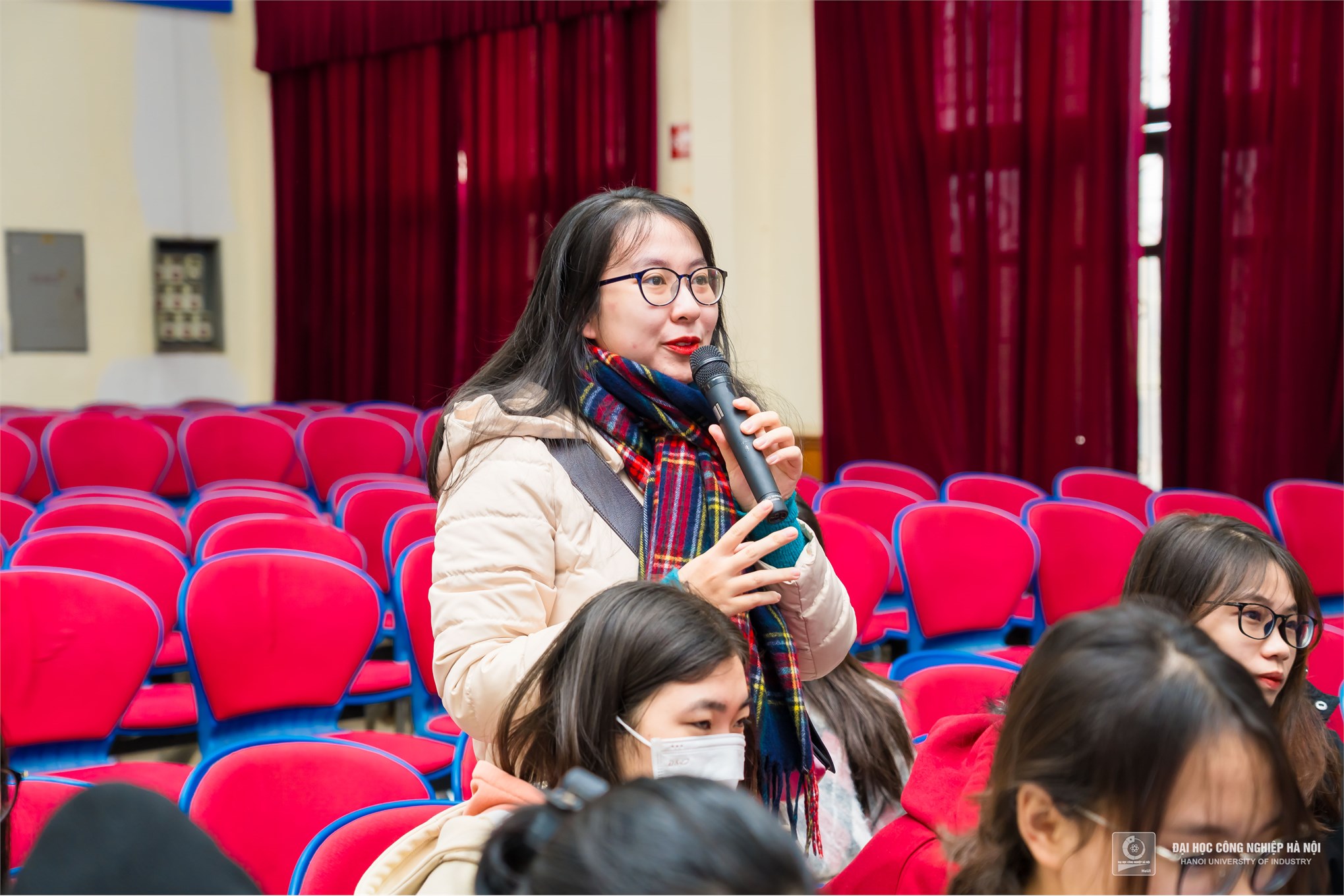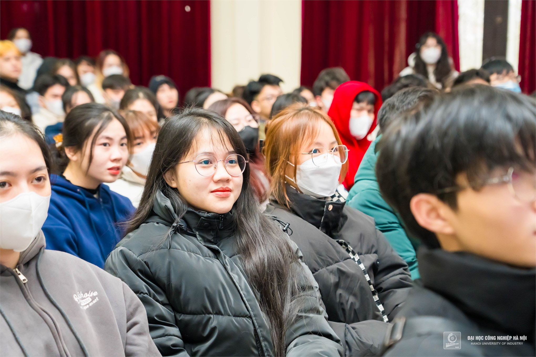 Sinh viên Khoa Công nghệ Hóa, Đại học Công nghiệp Hà Nội chăm chú dõi theo và giao lưu với diễn giả. Chắc chắn rằng, sau buổi tọa đàm hôm nay, các bạn sinh viên sẽ có thêm thật nhiều kiến thức, bỏ túi nhiều kinh nghiệm để tự mình có thể tạo nên bản sắc riêng, gây ấn tượng và khẳng định bản thân trước nhà tuyển dụng.
