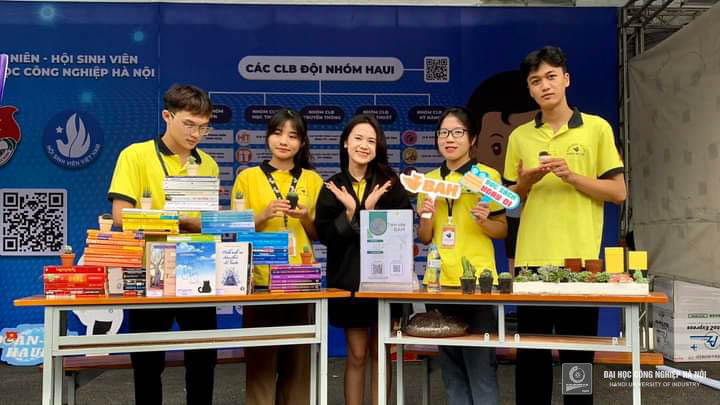 Hoàng Thị Hoa (thứ hai, từ trái qua) cùng các thành viên CLB Sách và Hành động tham gia Ngày hội chào tân sinh viên, HaUI