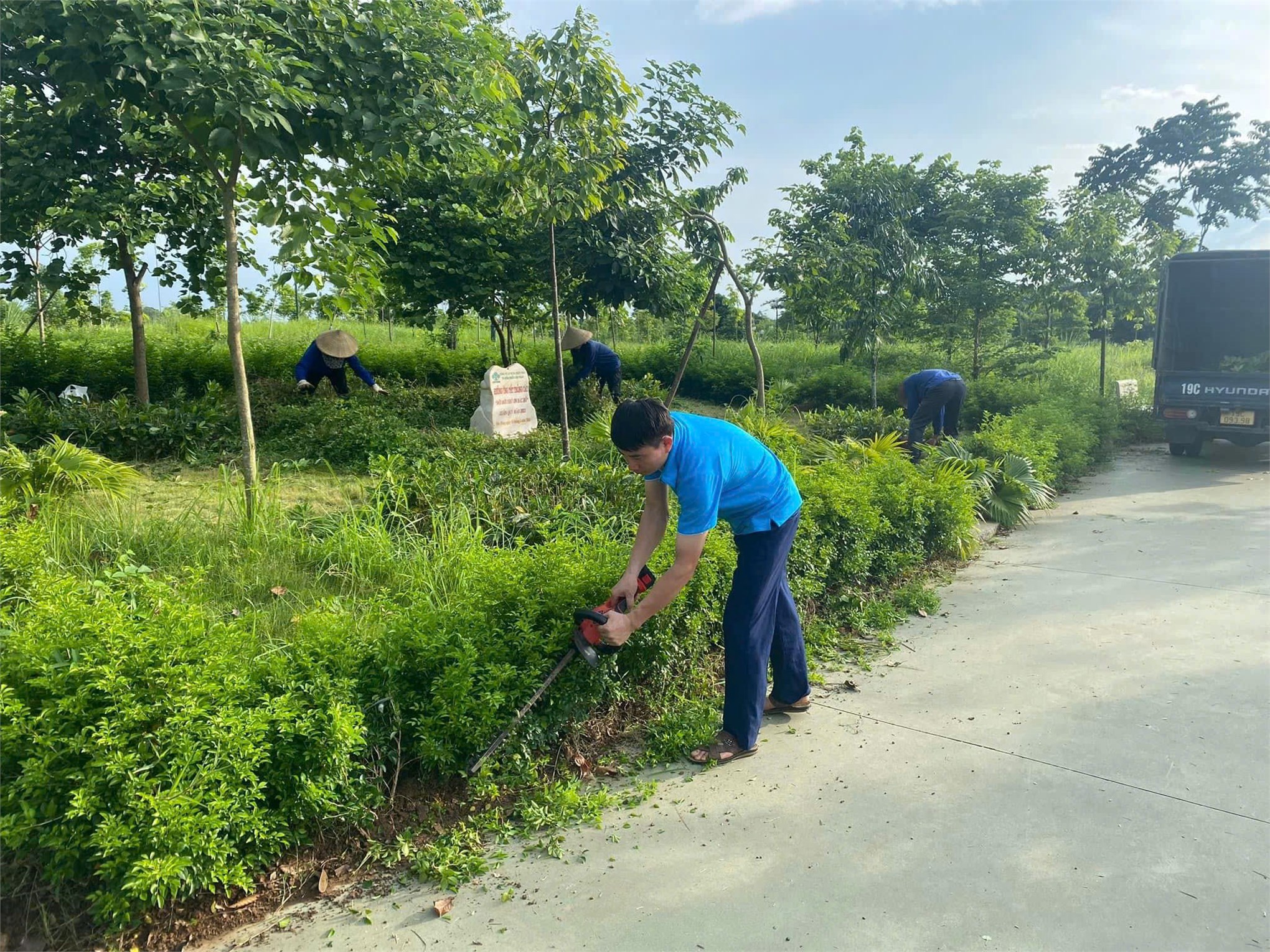 Anh Trần Xuân Thành, Bí thư Đoàn Thanh niên Công ty cùng các đồng chí đoàn viên thanh niên công ty chăm sóc vườn cây của Đoàn Thanh niên Công ty tại đồi Phú Bùng, khu Di tích lịch sử Đền Hùng.