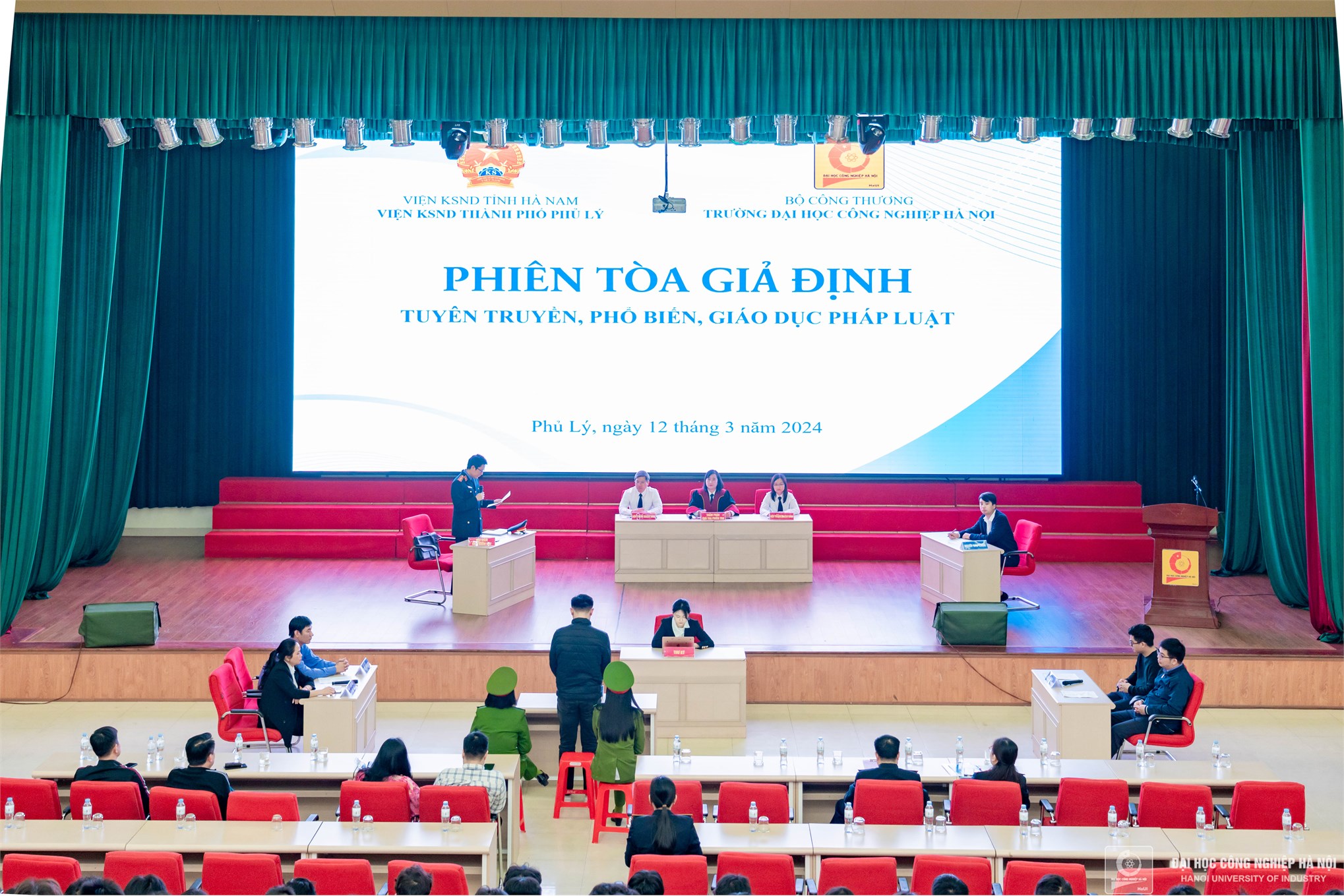 Chiều 12/3, Trường Đại học Công nghiệp Hà Nội cơ sở Hà Nam phối hợp với Viện Kiểm sát nhân dân thành phố Phủ Lý tổ chức Phiên tòa giả định vụ án “trộm cắp tài sản” để tuyên truyền, phổ biến, giáo dục pháp luật cho gần 300 sinh viên nhà trường.