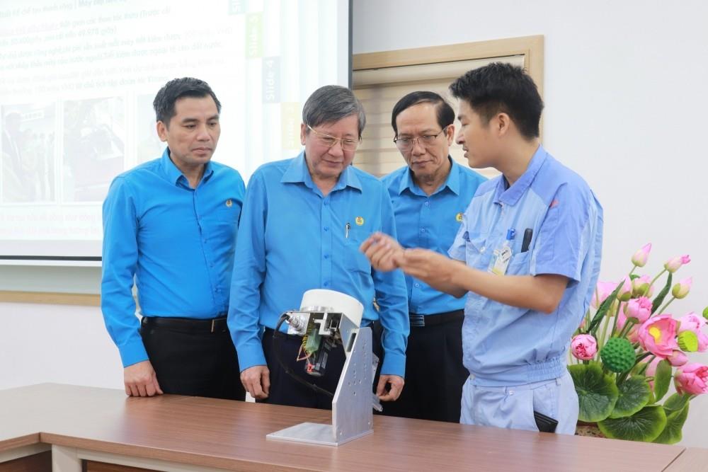 Kỹ sư Vũ Khắc Hùng (ngoài cùng, bên phải) giới thiệu với các đồng chí lãnh đạo Tổng LĐLĐ Việt Nam, LĐLĐ thành phố Hà Nội về những sáng kiến, sáng tạo đã thực hiện tại Hội nghị sơ kết giai đoạn 1 Chương trình “1 triệu sáng kiến, nỗ lực, vượt khó, sáng tạo quyết tâm chiến thắng đại dịch Covid-19”