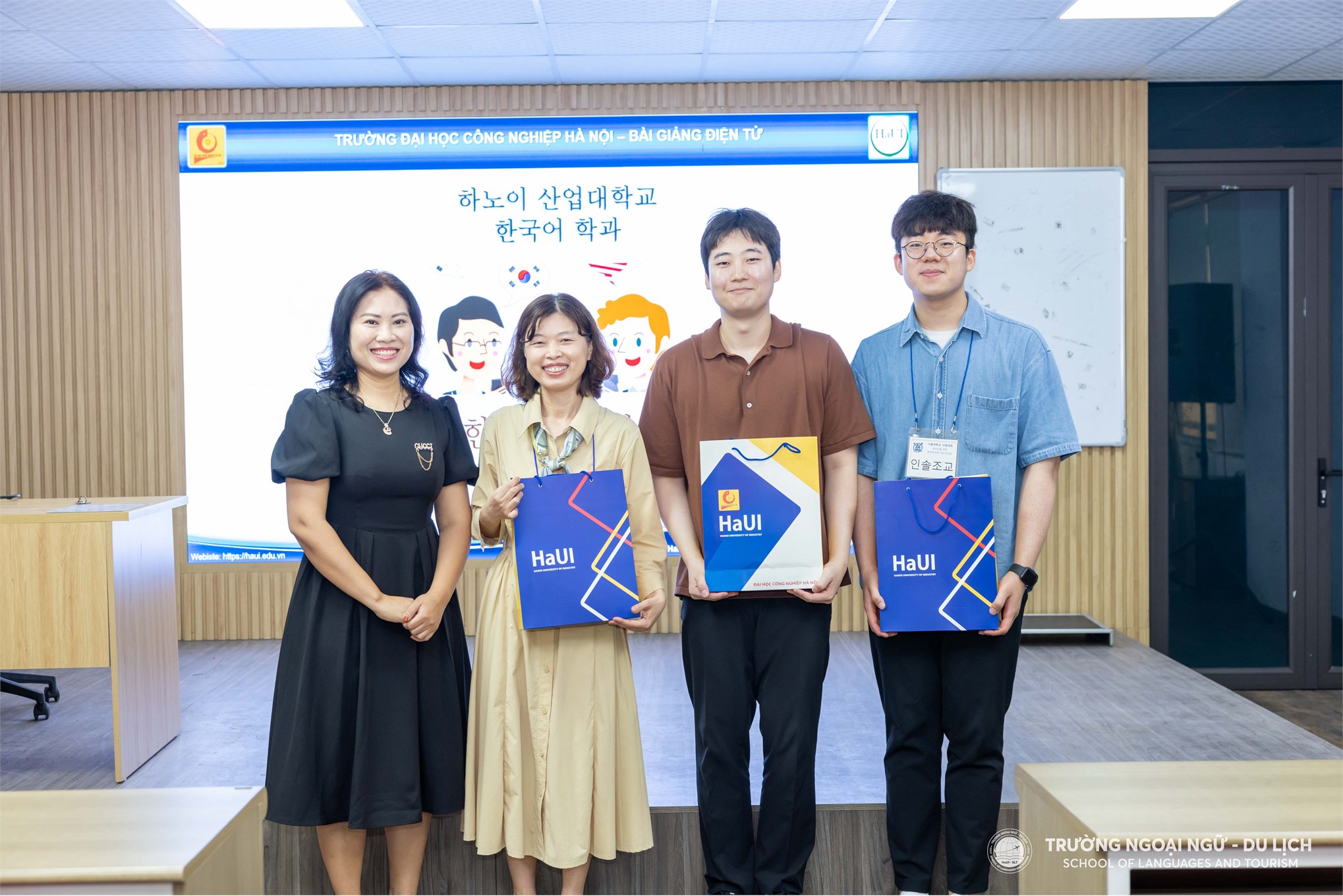 Tại chương trình, đại diện Trường Đại học Sư phạm - Đại học Quốc gia Seoul đã gửi tặng Trường Ngoại ngữ - Du lịch bộ giáo trình chất lượng do chính những chuyên gia đầu ngành của Đại học Quốc gia Seoul biên soạn. Thay mặt Trường Ngoại ngữ - Du lịch, ThS. Nguyễn Thị Ngọc Bích gửi đến đoàn Trường Đại học Sư phạm - Đại học Quốc gia Seoul những món quà lưu niệm tới đại diện đoàn và hy vọng về mối quan hệ khăng khít gắn bó giữa hai đơn vị trong thời gian tới.