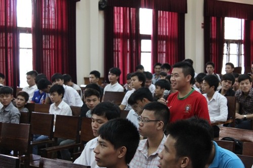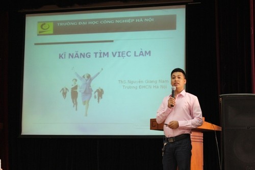 Thạc sĩ Nguyễn Giang Nam, giảng viên khoa Sư phạm - Du lịch, trường ĐH Công nghiệp Hà Nội đã có những trao đổi thiết thực về kỹ năng tìm việc trong khoá đào tạo ngắn “Kỹ năng tìm việc làm”, được tổ chức vào sáng ngày 18/8/2014 tại hội trường A, khu A.