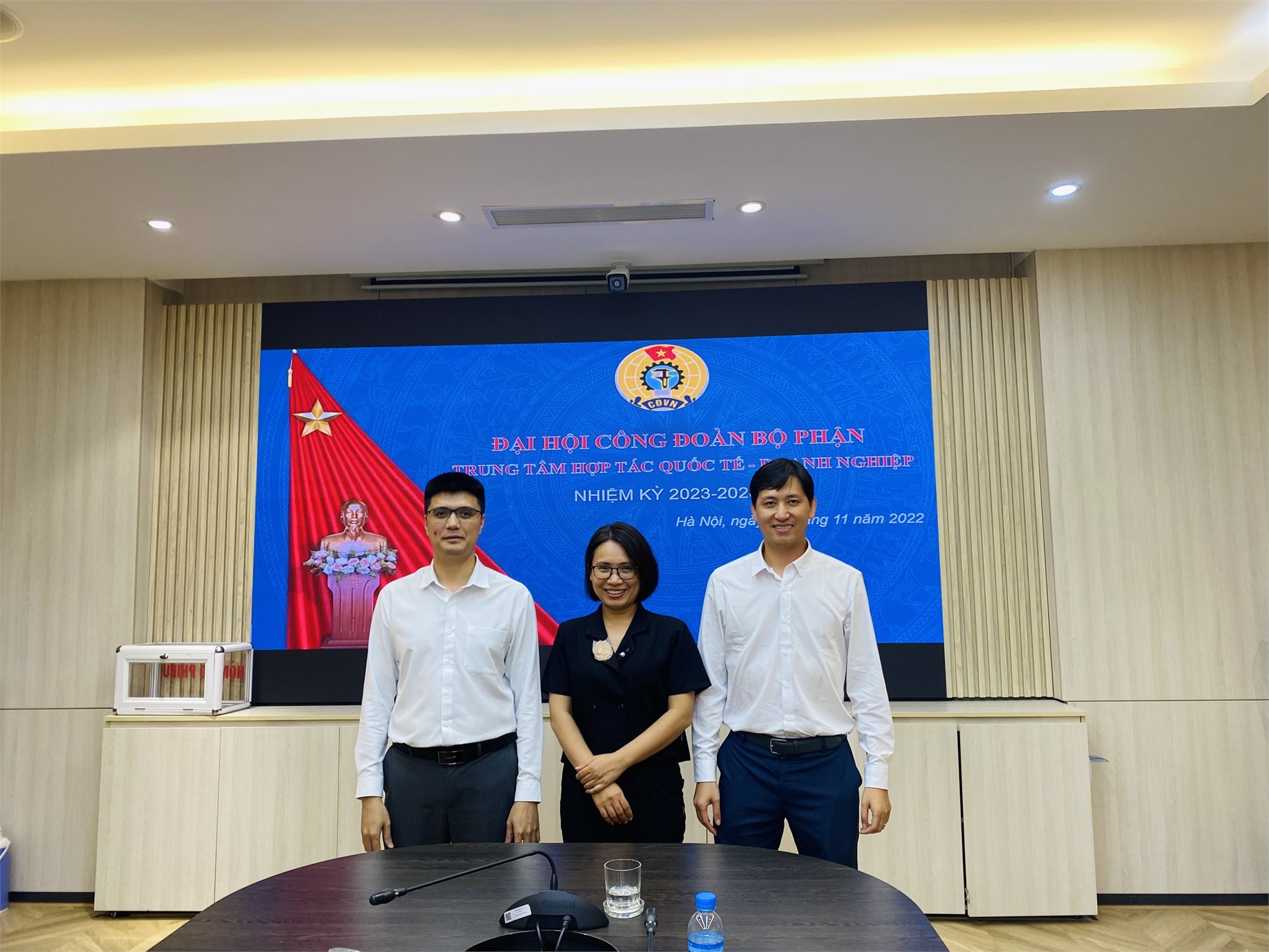 Ban chấp hành Công đoàn bộ phận trung tâm Hợp tác Quốc tế - Doanh nghiệp nhiệm kỳ 2023 - 2028: đ/c Nguyễn Tuấn Anh, đ/c Trần Viết Hồi, đ/c Ngô Ánh Tuyết