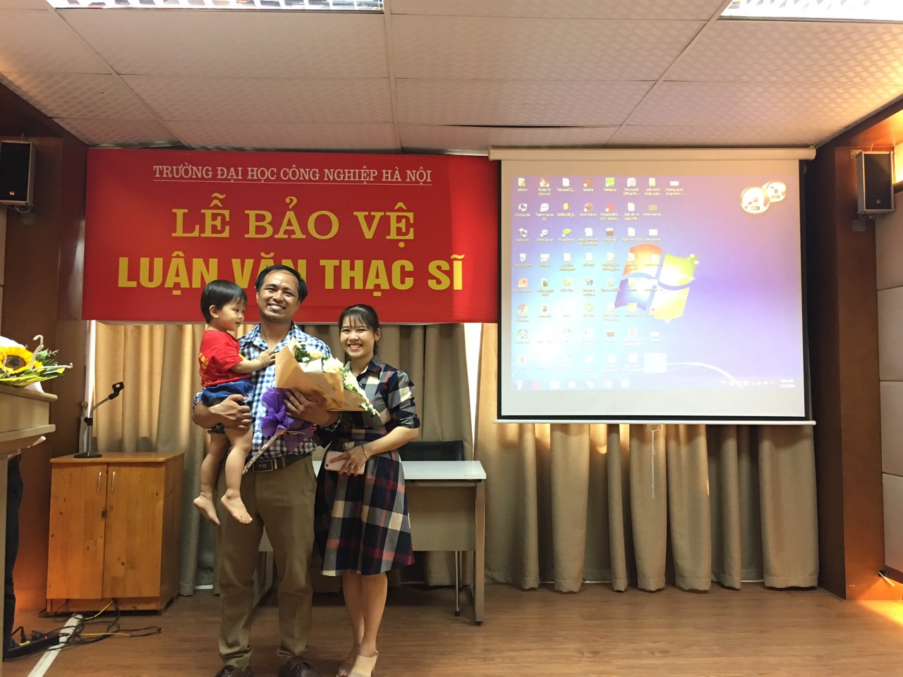 Học viên Nguyễn Xuân Hữu hạnh phúc bên gia đình nhỏ sau Lễ bảo vệ