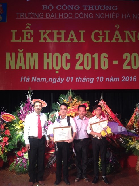 Thầy trưởng phòng Công tác HSSV trao quyết định khen thưởng và tiền thưởng cho các em sinh viên tại lễ khai giảng năm học mới.
