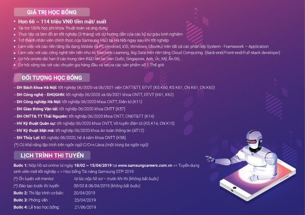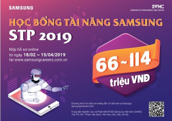 Các bạn trẻ hãy chinh phục học bổng toàn diện này để được khích lệ niềm đam mê sáng tạo và vươn lên làm chủ công nghệ, bắt kịp với sự cạnh tranh trên toàn cầu. Cơ hội tiếp cận với môi trường làm việc năng động, chuyên nghiệp và hiện đại như ở SAMSUNG, một Công ty điện tử hàng đầu Thế giới luôn mở ra với tất cả các bạn!