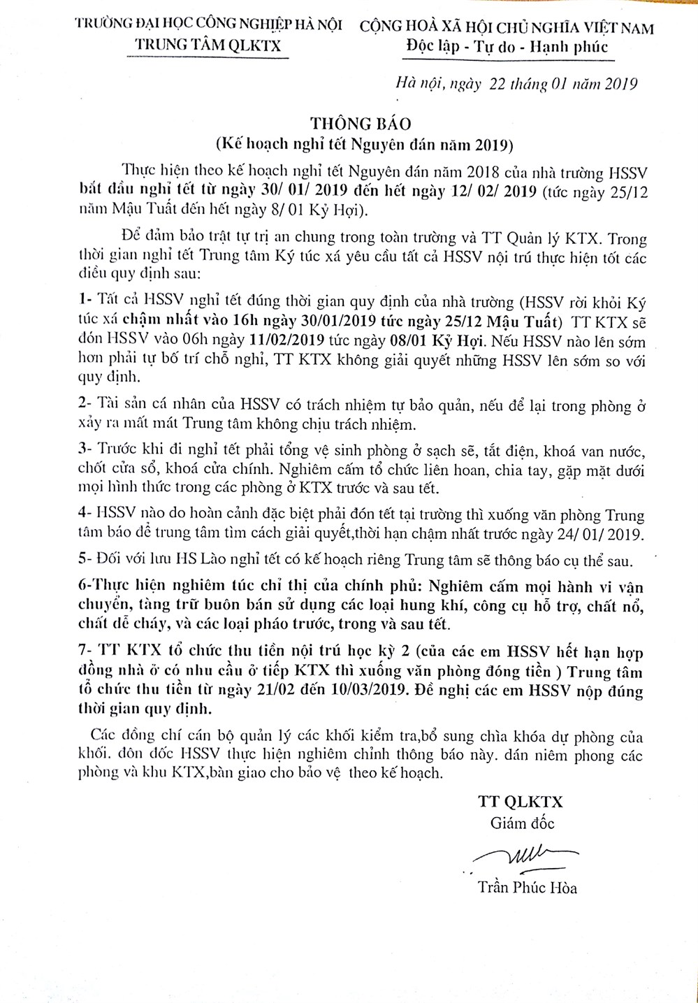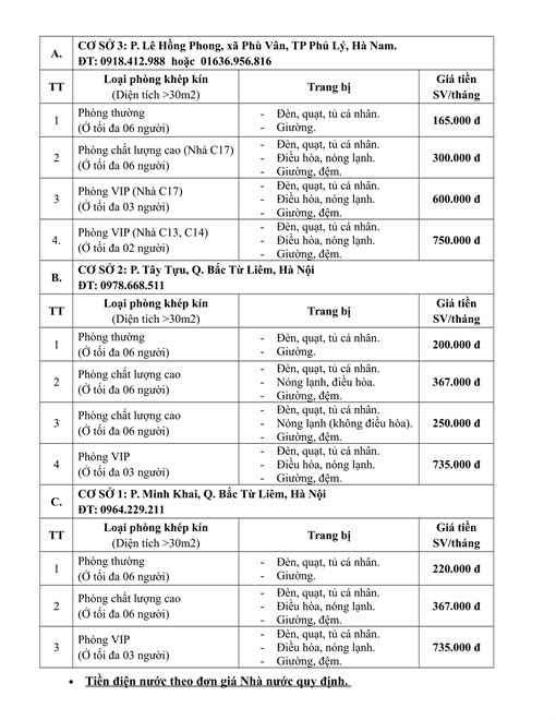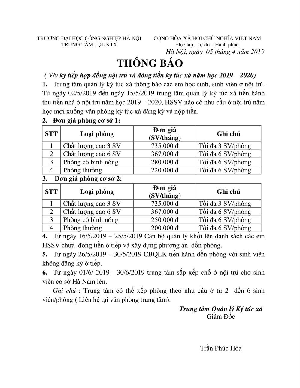 Trung tâm Quản lý Ký túc xá, Trường Đại học Công nghiệp Hà Nội được hình thành trên cơ sở Quyết định số 1370/QĐ-ĐHCN ngày 14 tháng 11 năm 2016 về việc đổi tên Trung tâm Dịch vụ - Nhà ăn - Ký túc xá. Đối tượng ở nội trú Đầu năm học, Trung tâm sẽ nhận đơn và xét cho học sinh, sinh viên ở nội trú theo thứ tự các điều kiện ưu tiên trong quy chế học sinh, sinh viên nội trú của Bộ Giáo dục và Đào tạo ban hành, sau đó sẽ xếp theo nhu cầu, nguyện vọng của HSSV... Xem tiếp