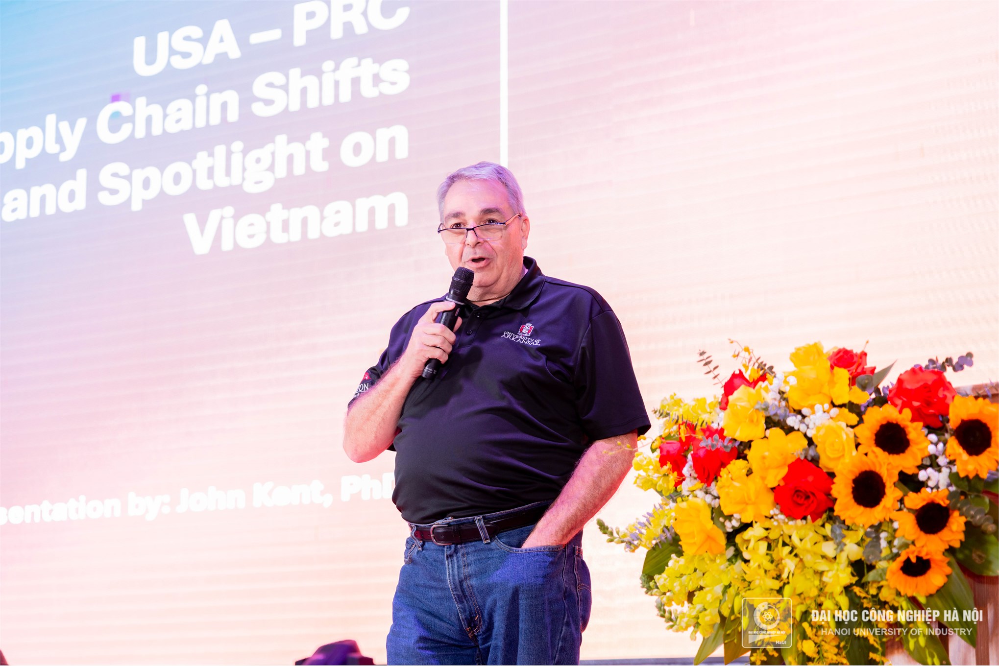 Dành thời gian chia sẻ tại Hội thảo, GS.TS John Kent, Trường Đại học Arkansas (Hoa Kỳ), người có 30 năm kinh nghiệm phát triển các chuỗi cung ứng Hoa Kỳ - Trung Quốc đã có tham luận với chủ đề: Sự chuyển dịch chuỗi cung ứng Mỹ - Trung Quốc và điểm sáng Việt Nam. Đây là một chủ đề đang thu hút sự quan tâm lớn từ các chuyên gia, doanh nghiệp và các nhà quản lý trong bối cảnh Việt Nam ngày càng hội nhập sâu rộng vào nền kinh tế toàn cầu.