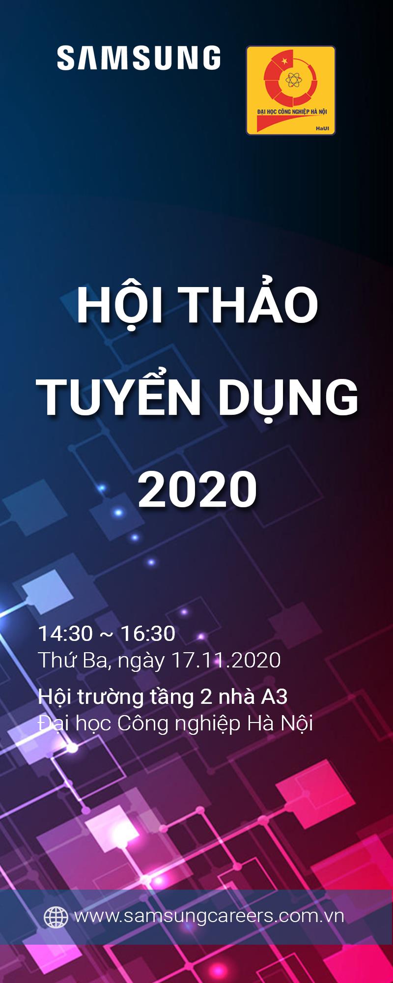 Trường Đại học Công nghiệp Hà Nội phối hợp với Công ty TNHH Samsung Electronics Việt Nam tổ chức chương trình "Hội thảo cơ hội việc làm của Công ty TNHH Samsung Electronics Việt Nam" nhằm giới thiệu với sinh viên đã tốt nghiệp trình độ Đại học và sinh viên Đại học chính quy khóa 12 về cơ hội thực tập, việc làm tại công ty. Cụ thể như sau: