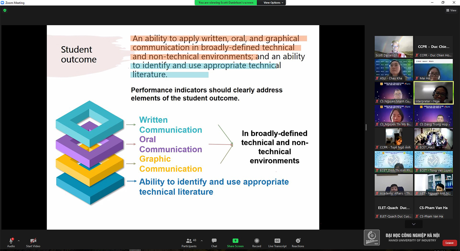 Trong hai ngày 11 và 13/01/2022, Đại học Công nghiệp Hà Nội phối hợp với Đại học Arizona State và Dự án BUILD-IT tổ chức Hội thảo trực tuyến “Đánh giá hiệu quả mức độ đạt chuẩn đầu ra sinh viên” với sự tham gia của 50 cán bộ, giảng viên của Đại học Công nghiệp Hà Nội.