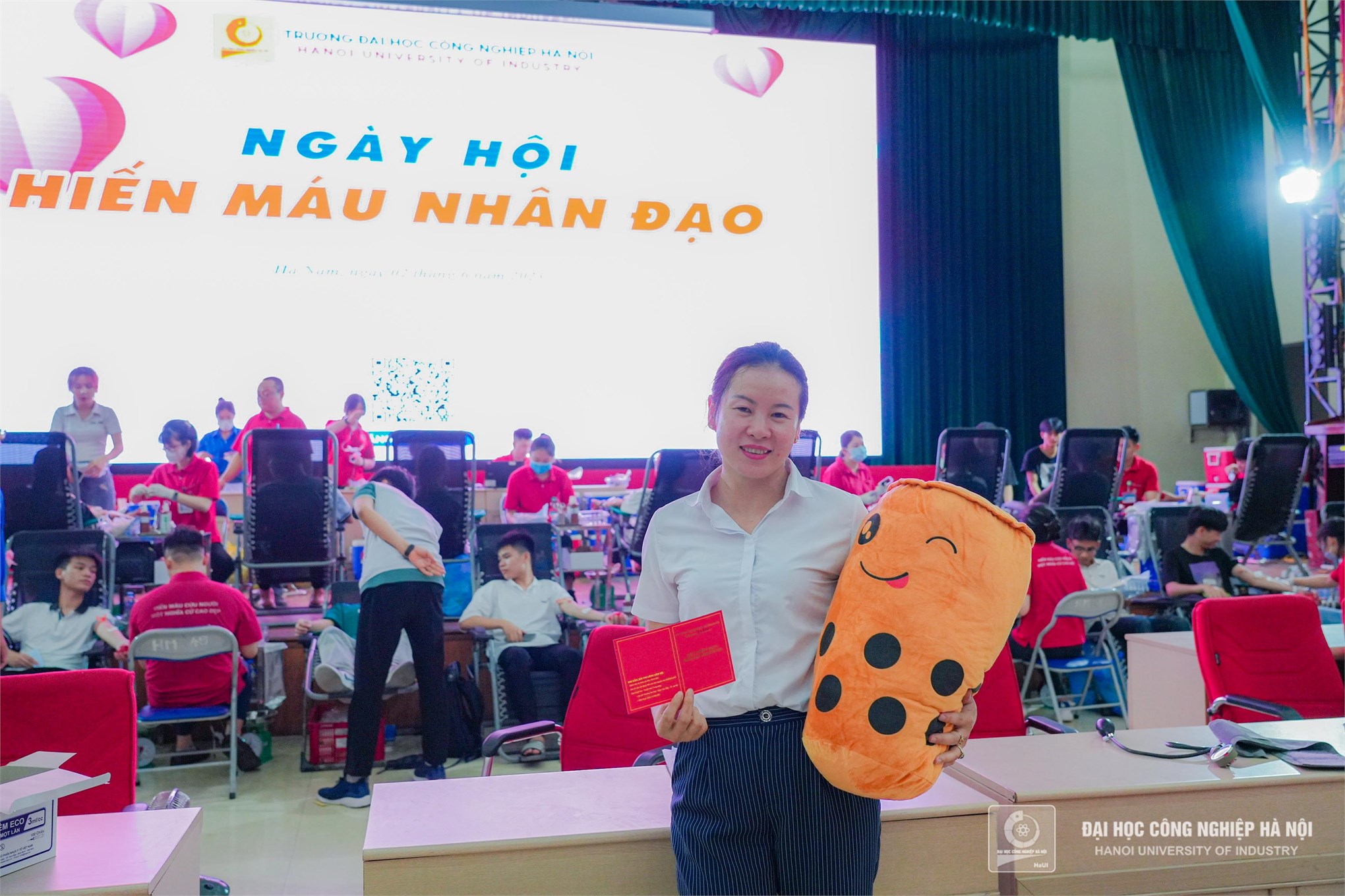 Cô Lâm Thủy - Cán bộ phòng Công tác Sinh viên, Đại học Công nghiệp Hà Nội cũng rất vui sau khi tham gia hiến máu.
