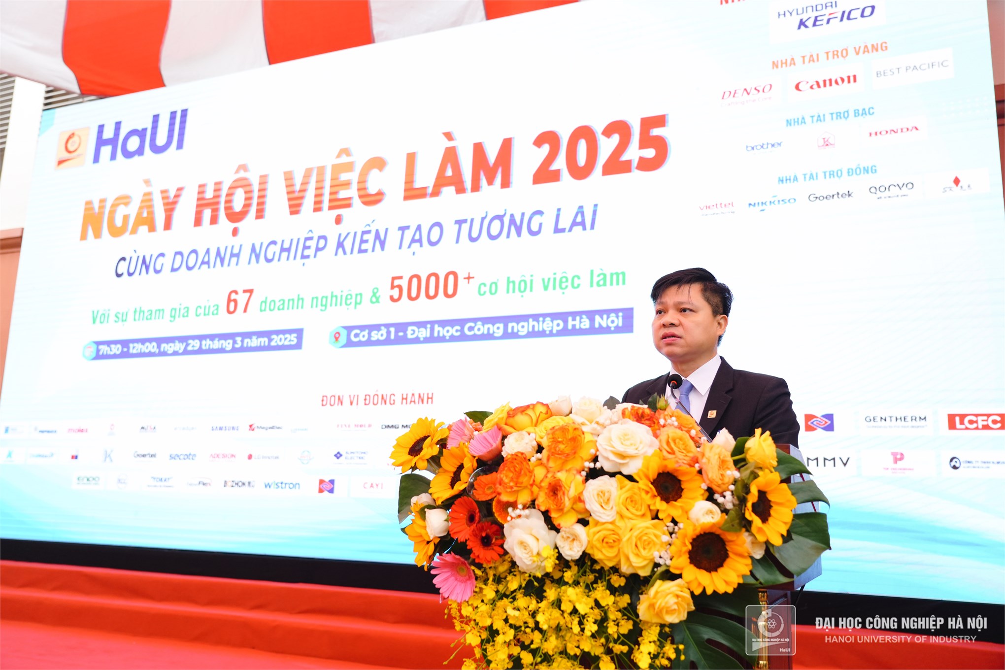 Phát biểu khai mạc tại Ngày hội việc làm Trường Đại học Công nghiệp Hà Nội năm 2025, PGS.TS.Phạm Văn Đông - Phó Hiệu trưởng nhà trường bày tỏ mong muốn hợp tác cùng các doanh nghiệp với các nội dung: (1) Mở rộng hợp tác quốc tế trong đào tạo, thực tập sản xuất với các cơ sở giáo dục và các doanh nghiệp trong và ngoài nước; (2) Thu hút sinh viên các nước tới học tập, nghiên cứu tại HaUI, sau tốt nghiệp sẽ làm việc cho doanh nghiệp, doanh nghiệp sẽ hỗ trợ kinh phí khi học tập tại HaUI; (3) Hợp tác đầu tư nguồn lực đào tạo nhân lực chất lượng cao như công nghệ, máy, thiết bị,… phù hợp với công nghệ sản xuất của doanh nghiệp; (4) HaUI kêu gọi các đơn vị, doanh nghiệp, hợp tác, đầu tư cho đào tạo tại HaUI, cùng nhau hướng tới tương lai, đào tạo nguồn nhân lực chất lượng cao đáp ứng yêu cầu của doanh nghiệp.