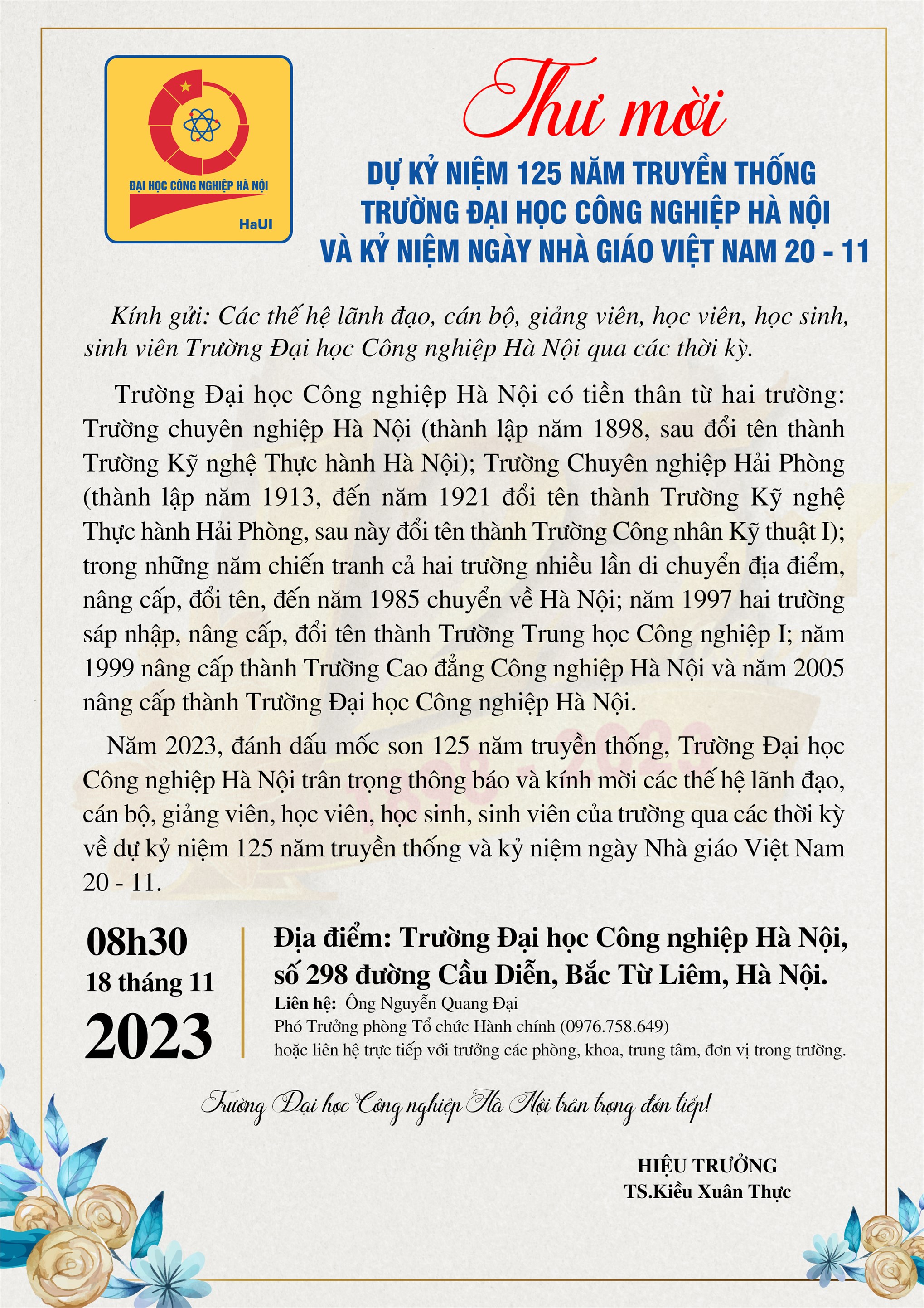 Thư mời dự Kỷ niệm 125 năm truyền thống Nhà trường và kỷ niệm ngày Nhà giáo Việt Nam 20 - 11