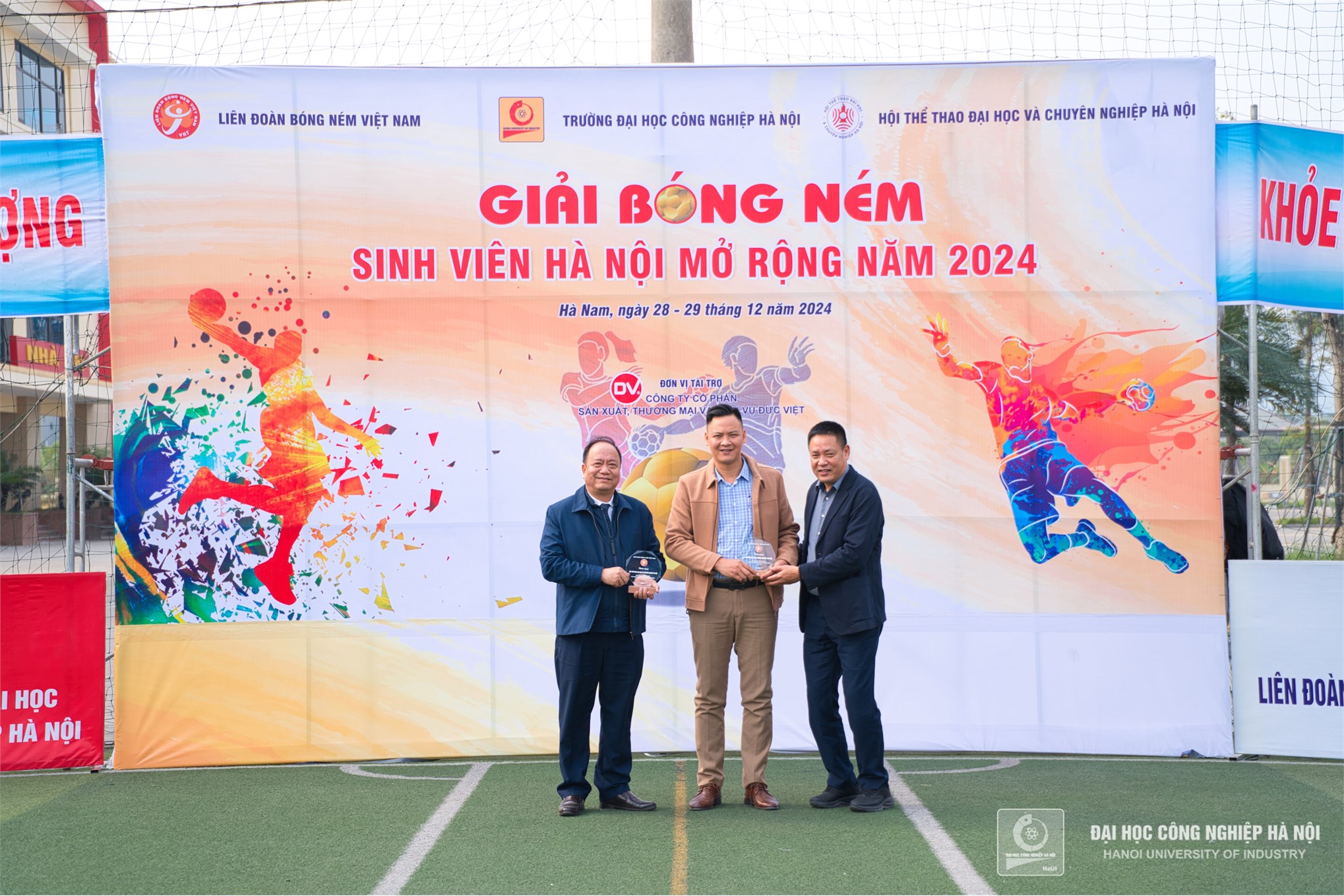 Ông Đào Đức Kiên - Tổng Thư ký Liên đoàn Bóng ném Việt Nam, trao tặng biểu trưng cho NGƯT.TS. Nguyễn Văn Thiện - Phó Hiệu trưởng Trường Đại học Công nghiệp Hà Nội, và TS. Đào Tiến Dân - Tổng thư ký Hội thể thao Đại học và chuyên nghiệp Hà Nội