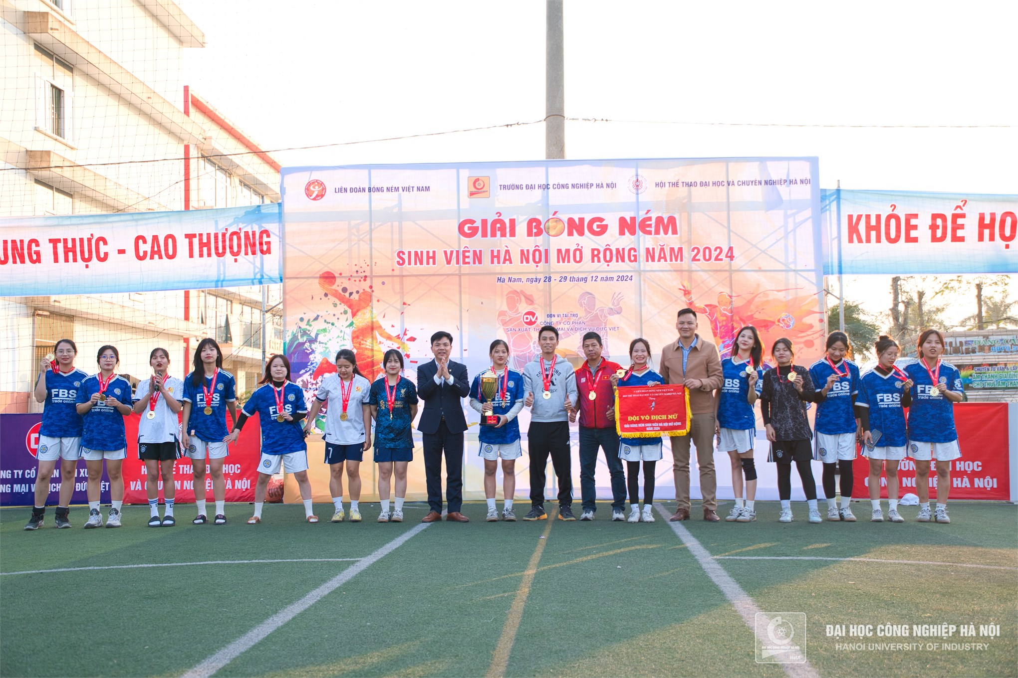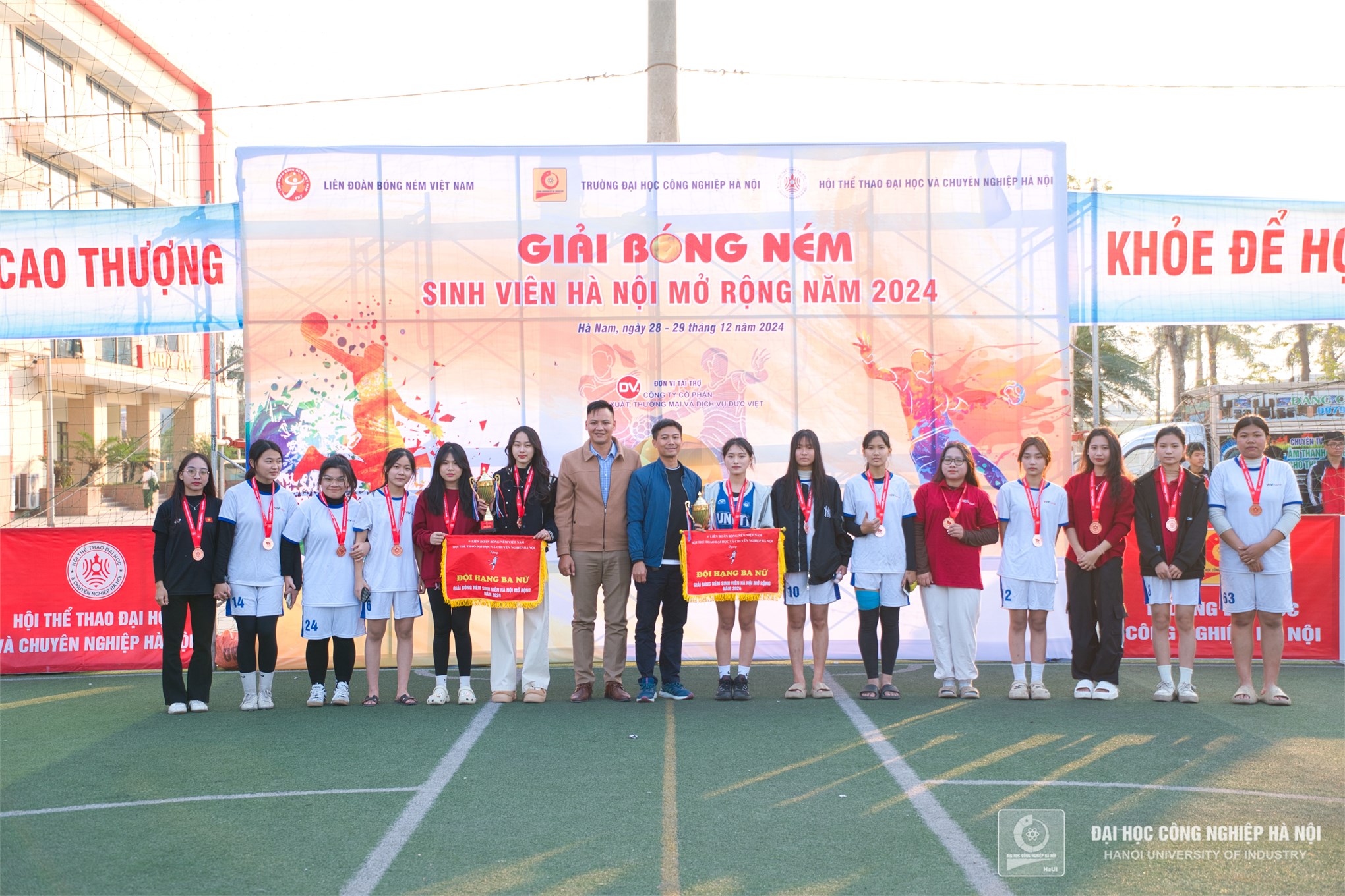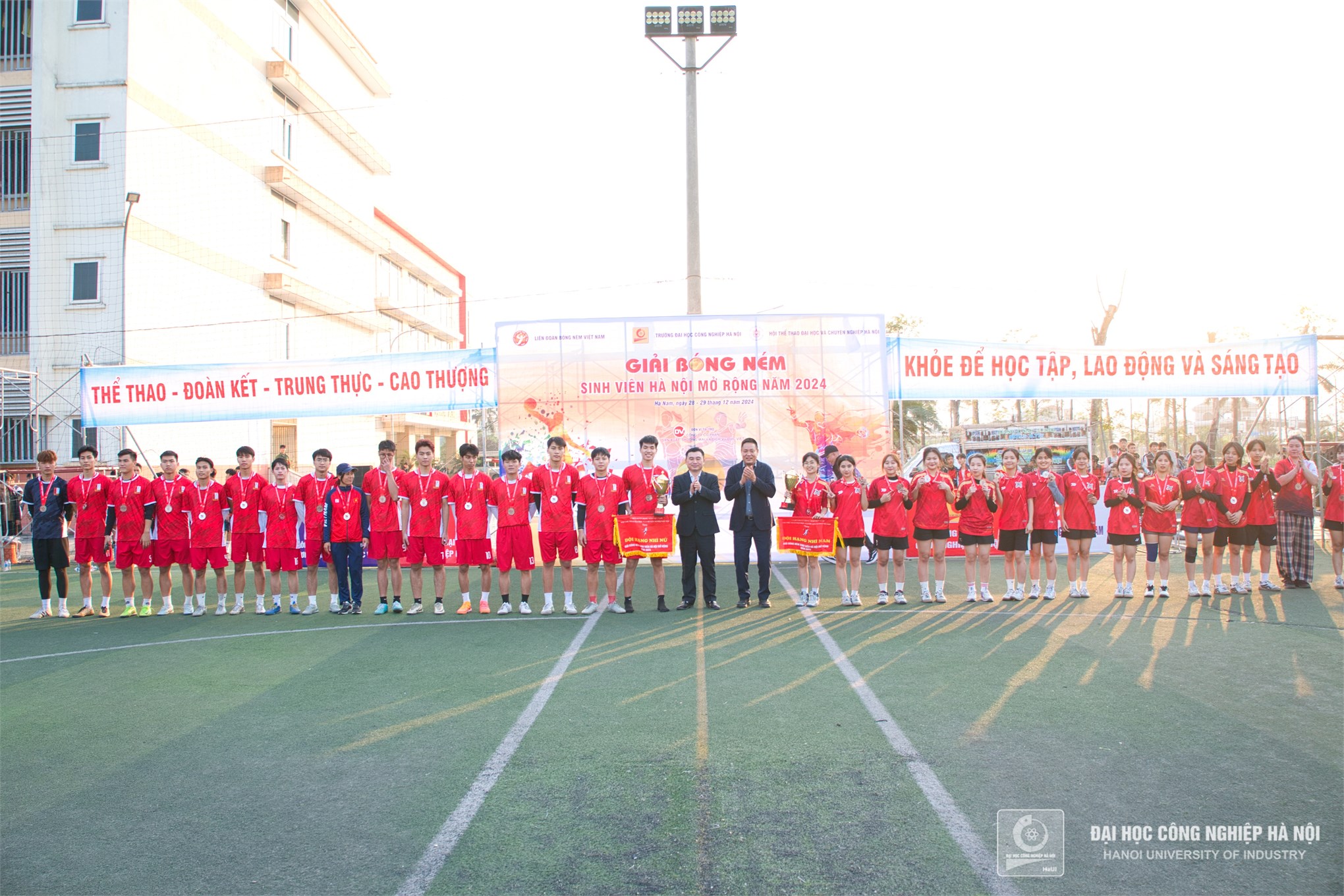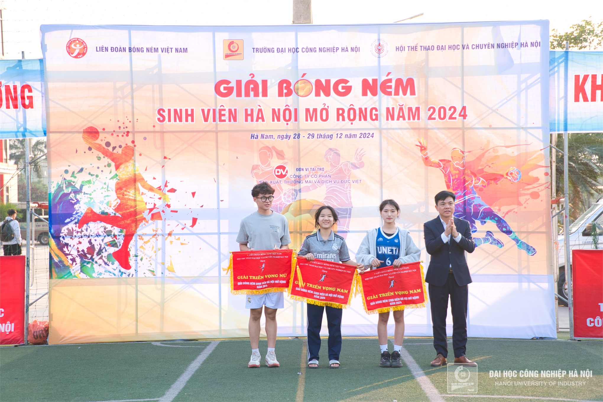 TS. Đào Tiến Dân - Tổng thư ký Hội thể thao Đại học và chuyên nghiệp Hà Nội và đồng chí Trần Xuân Kiên - Giám đốc Trung tâm Giáo dục Thể chất và Thể thao, Trường Đại học Công nghiệp Hà Nội trao giải nhất cho đội tuyển bóng ném nữ Trường Đại học Công nghiệp Hà Nội