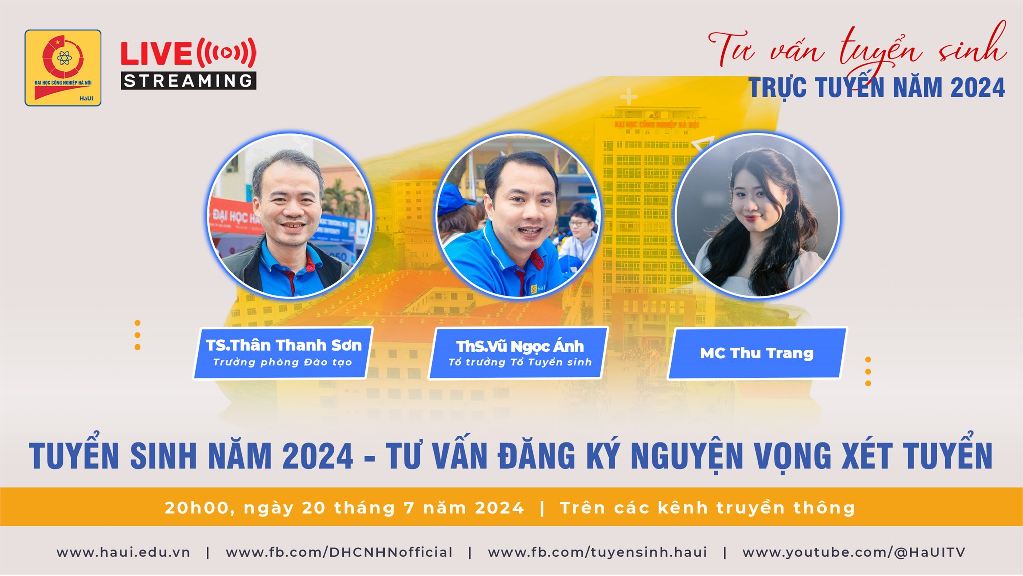 Vào khung giờ 20h - 20h30, thứ Bảy, ngày 20/7, buổi LIVE STREAM tư vấn tuyển sinh trực tuyến với chủ đề: Tư vấn đăng ký nguyện vọng xét tuyển sẽ giải đáp mọi thắc mắc cho quý vị phụ huynh và các em học sinh về những thông tin mùa tuyển sinh 2024 của Đại học Công nghiệp Hà Nội.