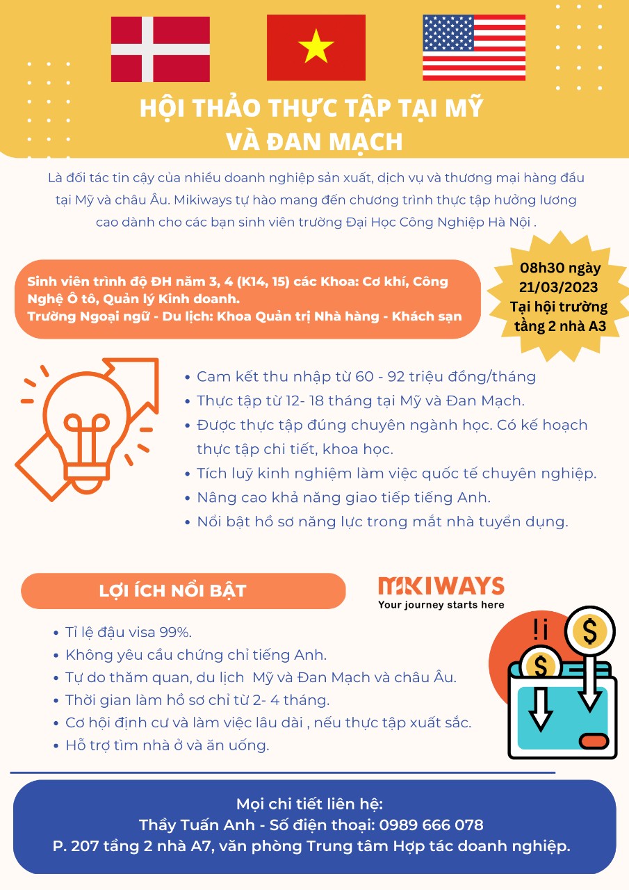 Trường Đại học Công nghiệp Hà Nội hợp tác với Công ty TNHH TM&DL Miki (Mikiways) tổ chức Hội thảo giới thiệu chương trình thực tập tại Đan Mạch và Mỹ.