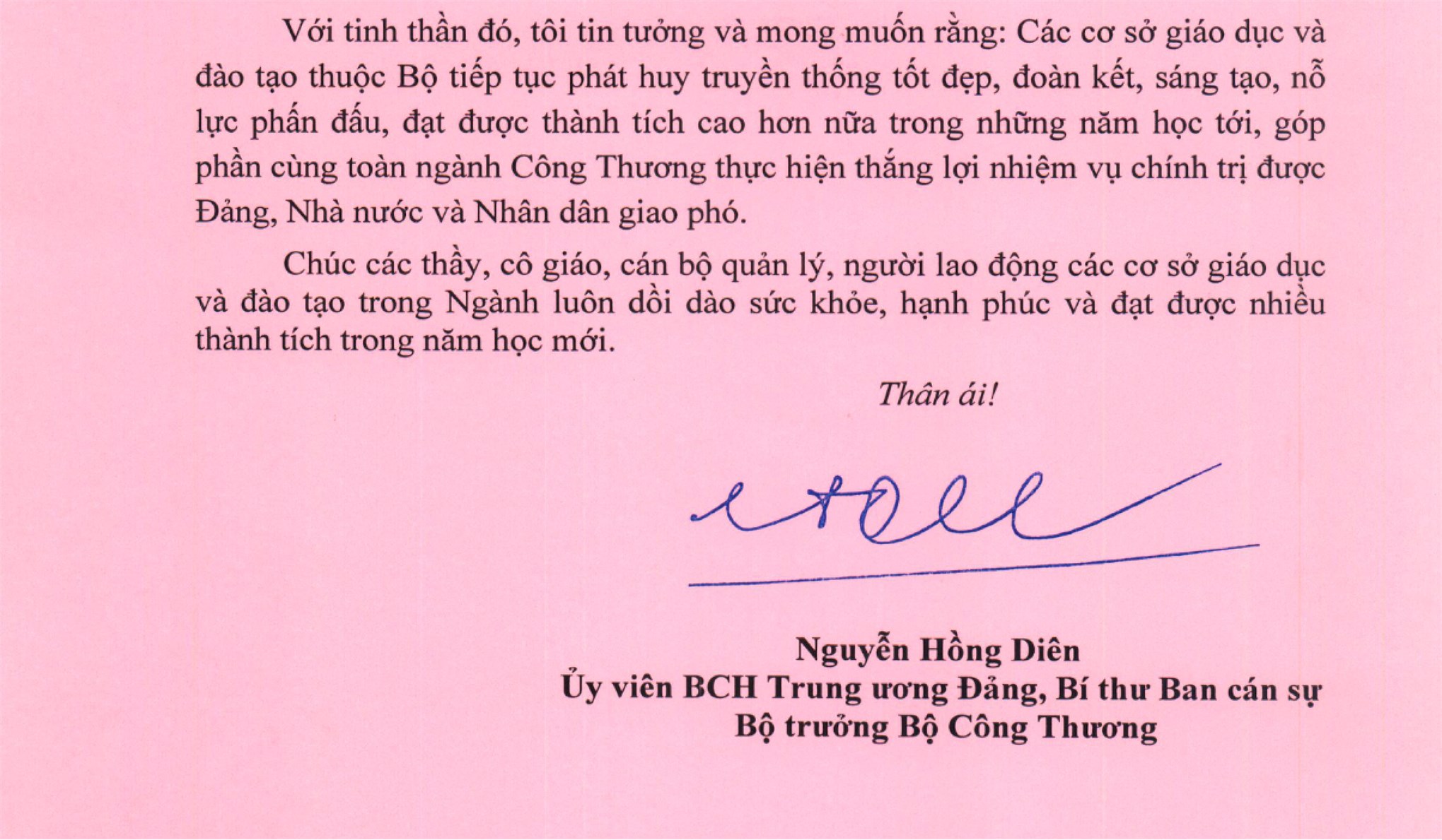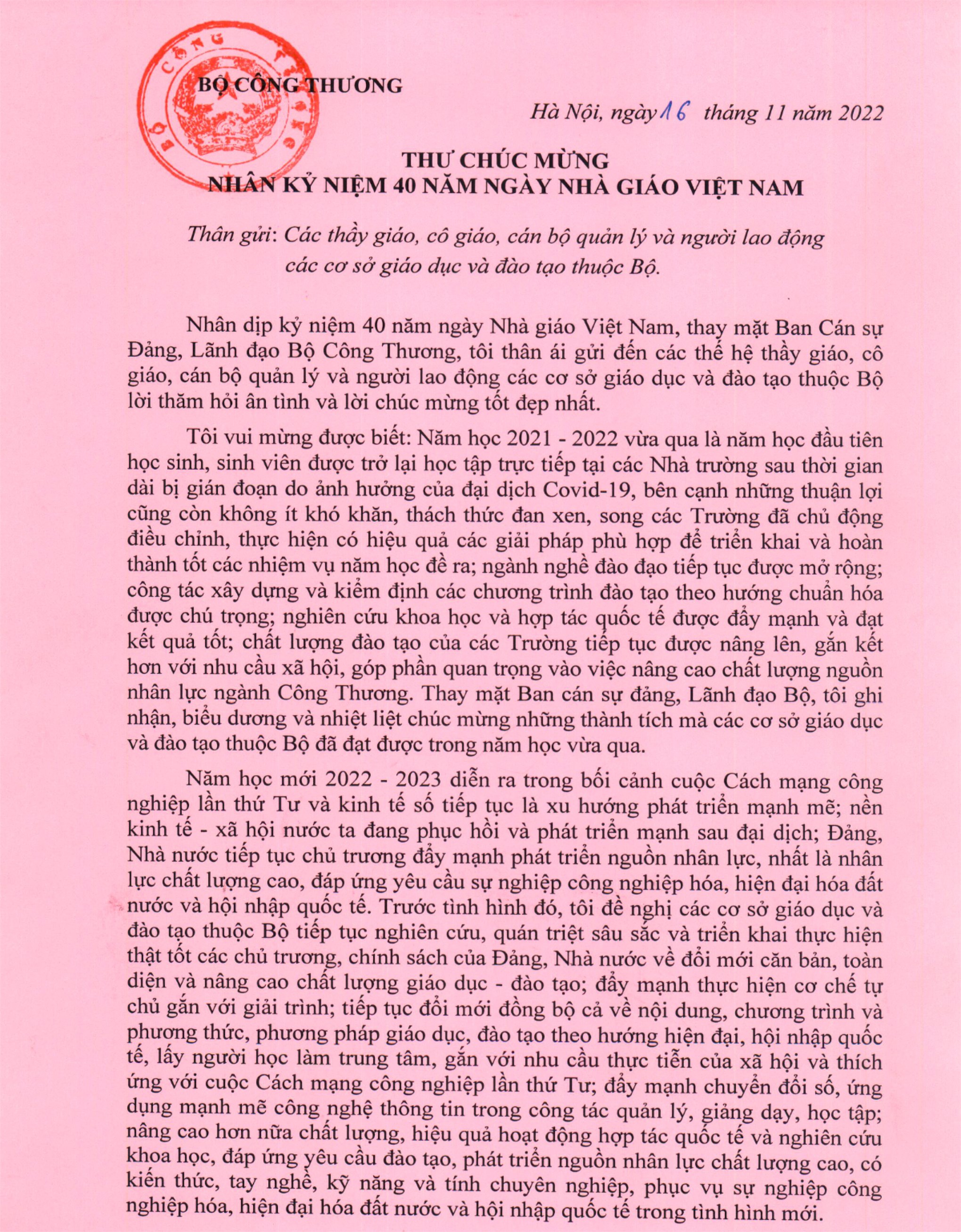 Bộ Trưởng Bộ Công Thương gửi thư chúc mừng nhân ngày Nhà Giáo Việt Nam 20/11