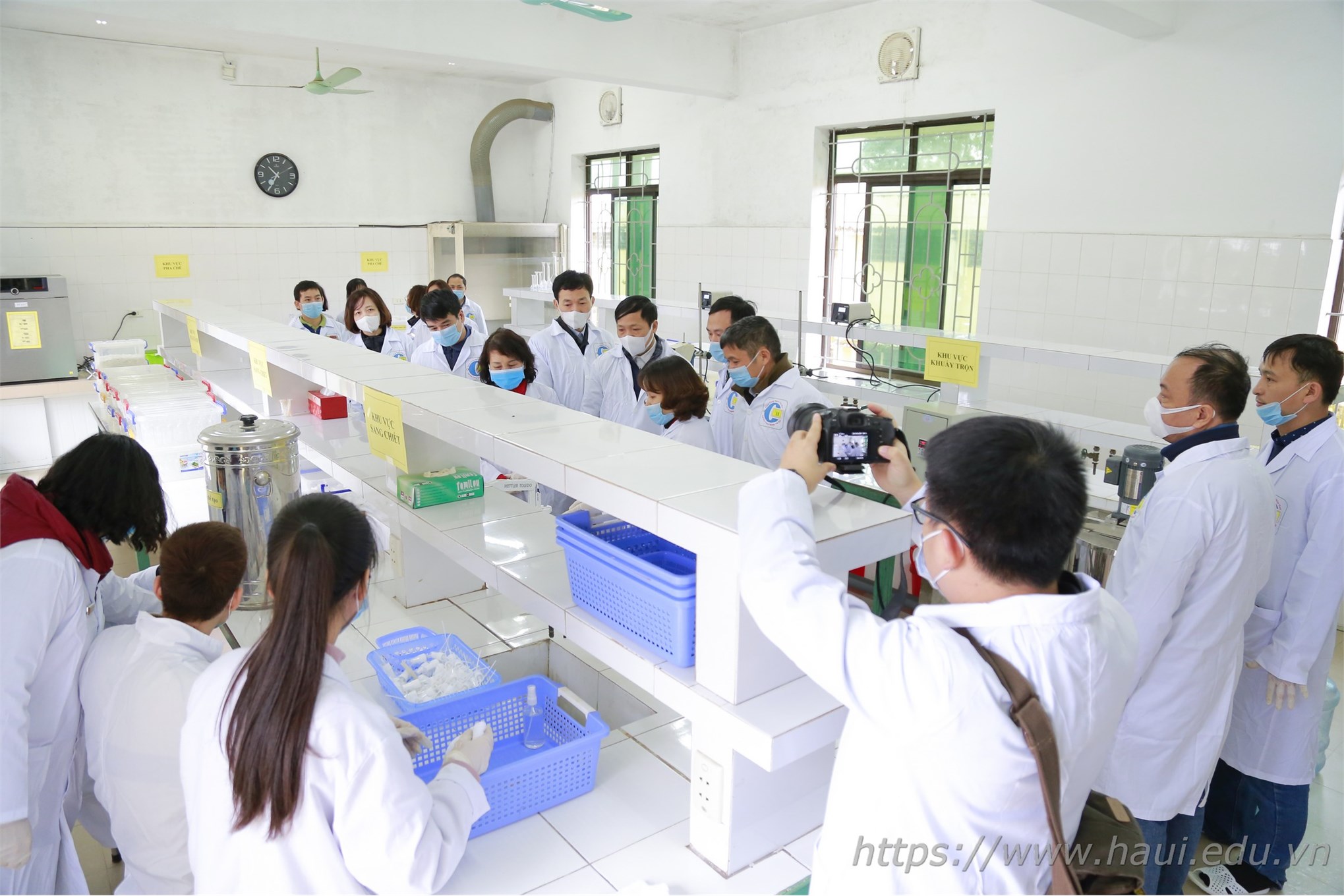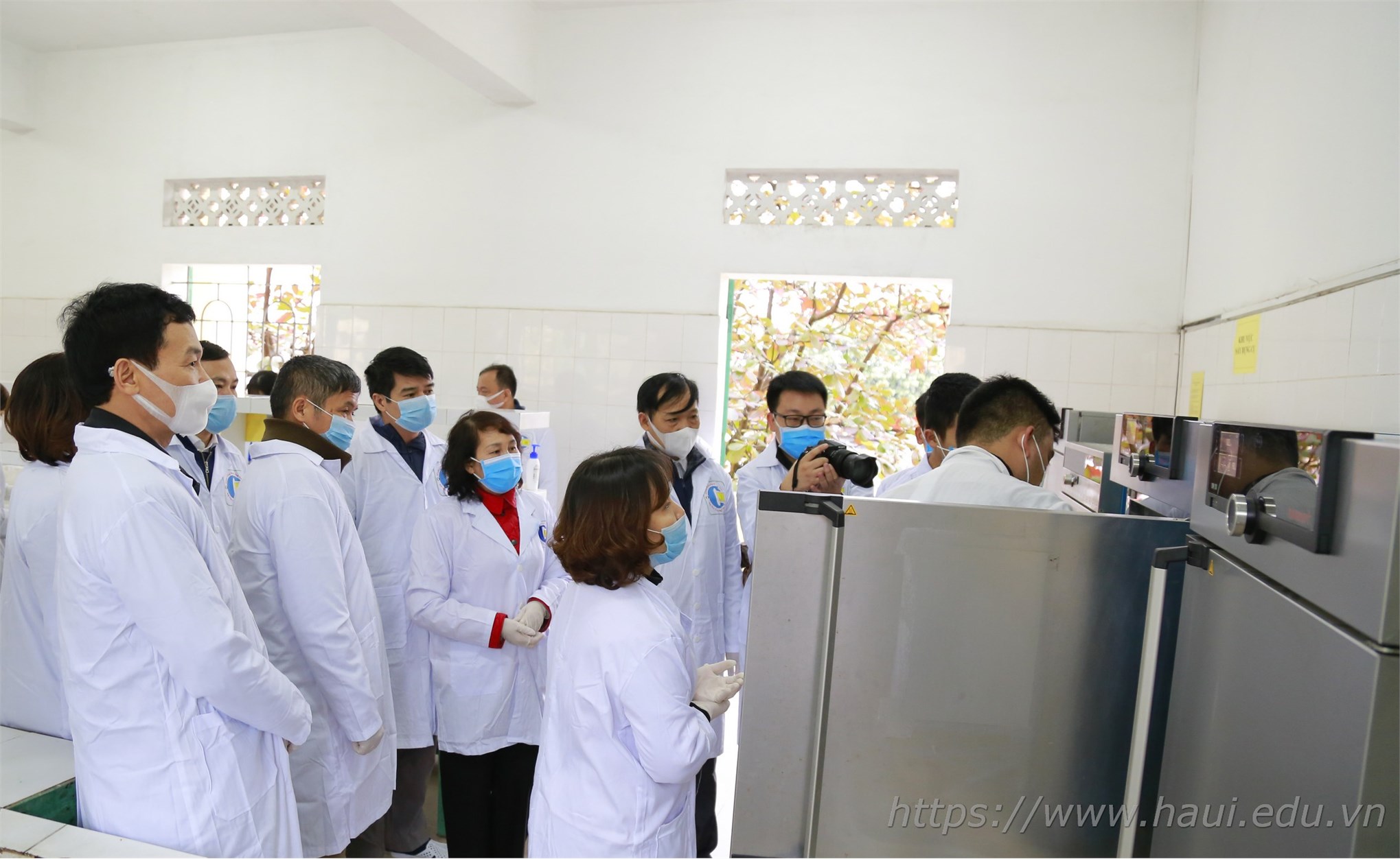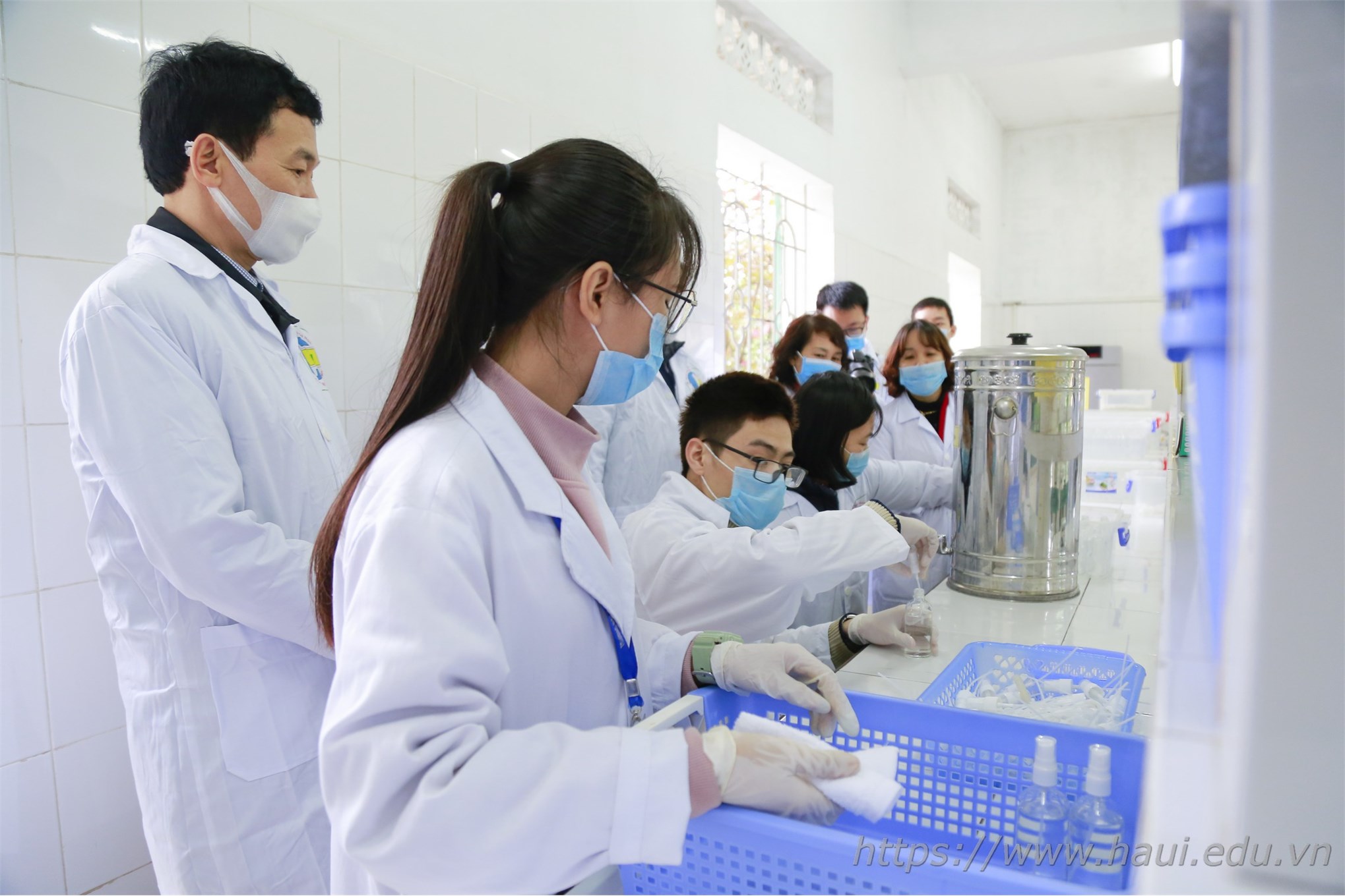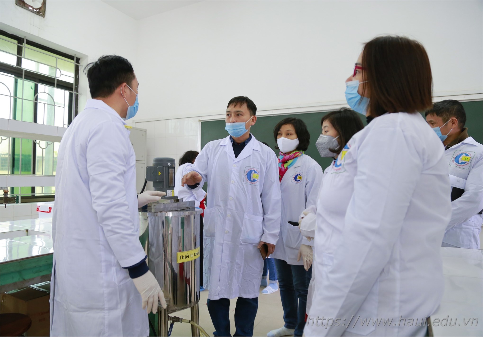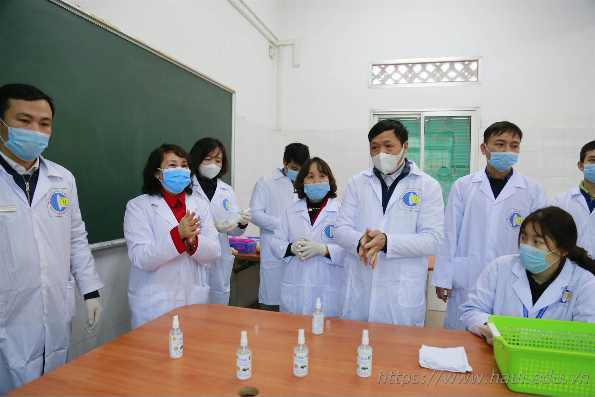 Kiểm tra công tác nghiên cứu và sản xuất dung dịch sát khuẩn, PGS.TS. Phạm Văn Bổng và TS. Bùi Thị Ngân - Phó hiệu trưởng Nhà trường đánh giá cao và biểu dương nỗ lực của thầy và trò khoa Công nghệ Hóa, góp phần phục vụ cán bộ, giảng viên, học viên, sinh viên nhà trường, chung tay cùng cả nước phòng chống dịch bệnh.