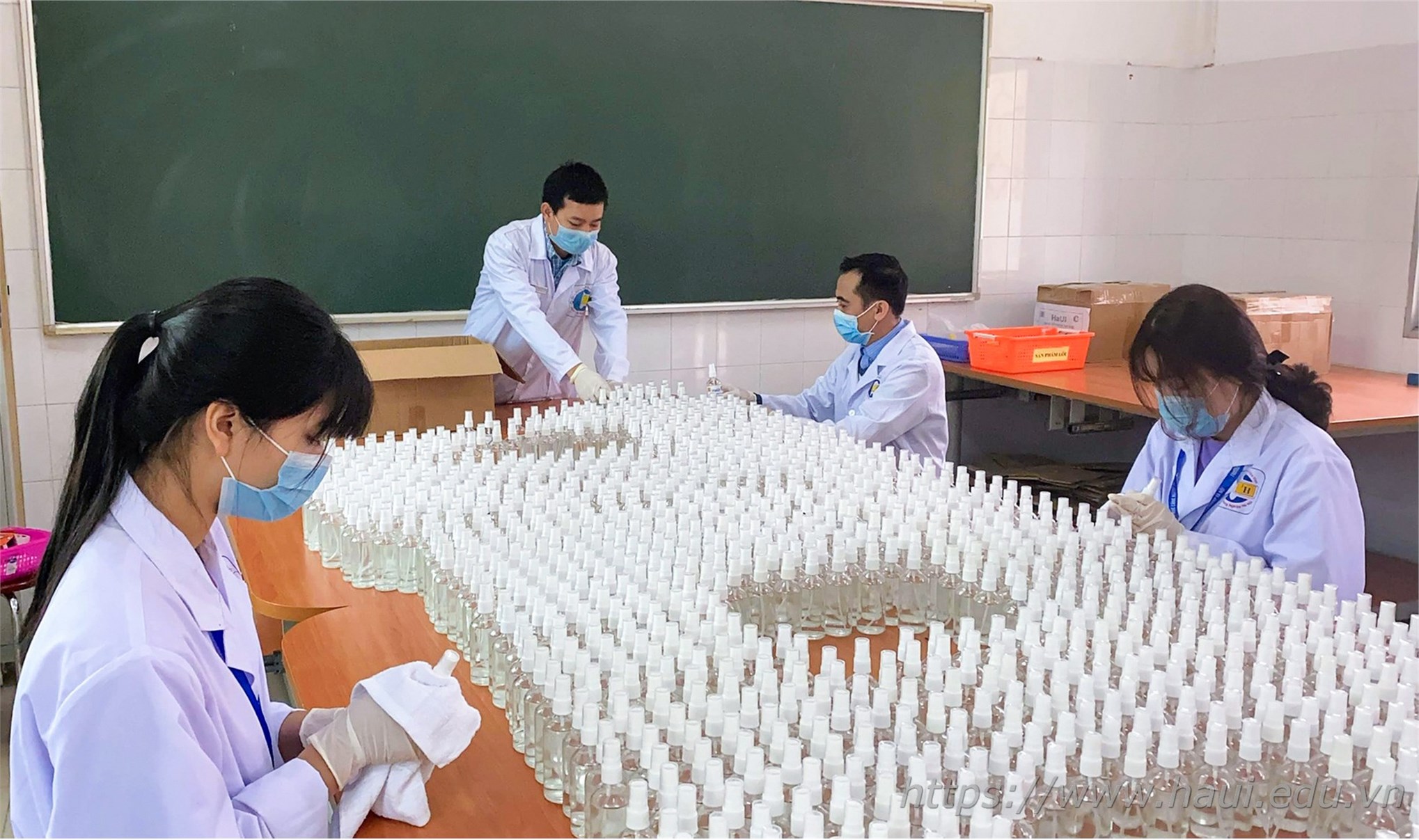 Theo đó, quy trình sản xuất dung dịch rửa tay khô sát khuẩn gồm các khâu: Xử lý nước sạch, nước cất, xử lý qua cồn y tế, vệ sinh, sấy chai; pha chế; khuấy trộn; sang chiết; kiểm tra sau sang chiết; dãn nhãn; kiểm tra sản phẩm và đóng gói. Toàn bộ quá trình sản xuất đều được thực hiện tại khoa Công nghệ Hóa bởi cán bộ, giảng viên và sinh viên trong khoa.