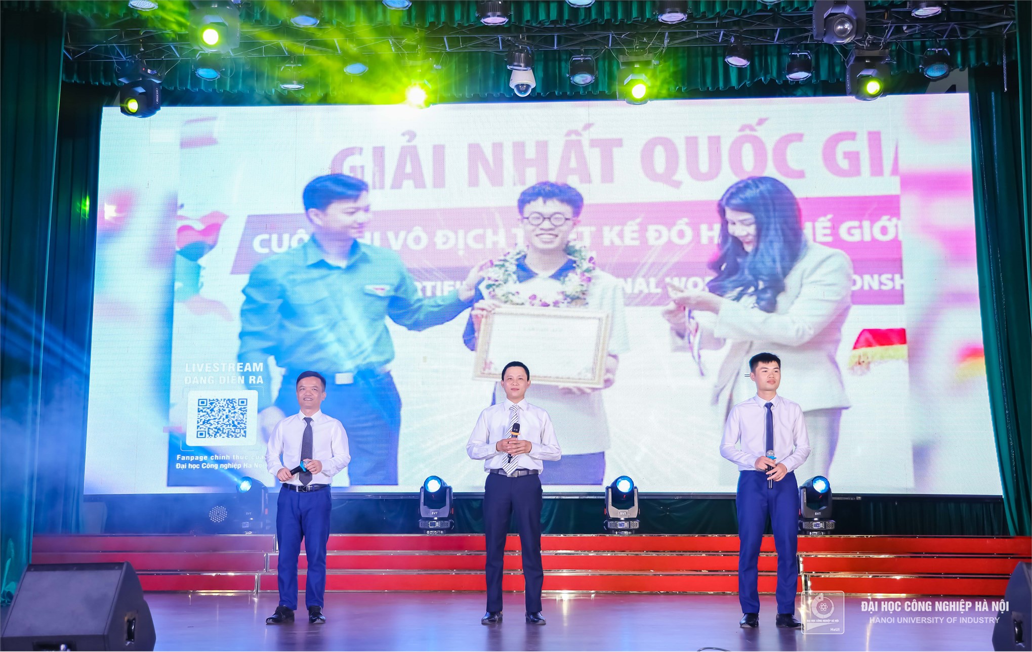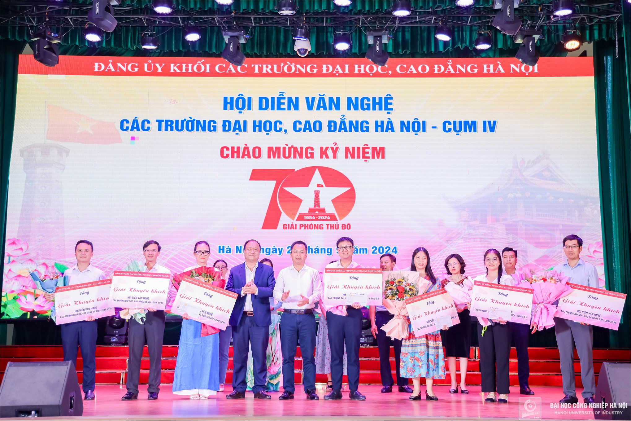Đồng chí Phạm Văn Hải - Trưởng Ban Tuyên giáo, Đảng ủy Khối các trường đại học cao đẳng Hà Nội và Đồng chí Nguyễn Văn Thiện - Phó Bí thư Thường trực Đảng ủy, Phó Hiệu trưởng Trường Đại học Công nghiệp Hà Nội đại diện cho đơn vị đăng cai trao giải Khuyến khích cho các trường: Trường Đại học Dược Hà Nội; Trường Đại học Khoa học và Công nghệ Hà Nội; Trường Đại học Công đoàn; Trường Đại học Hòa Bình; Trường Cao đẳng Nghề Công nghiệp Hà Nội; Trường Đại học Quốc tế Bắc Hà và Trường Cao đẳng xây dựng số 1