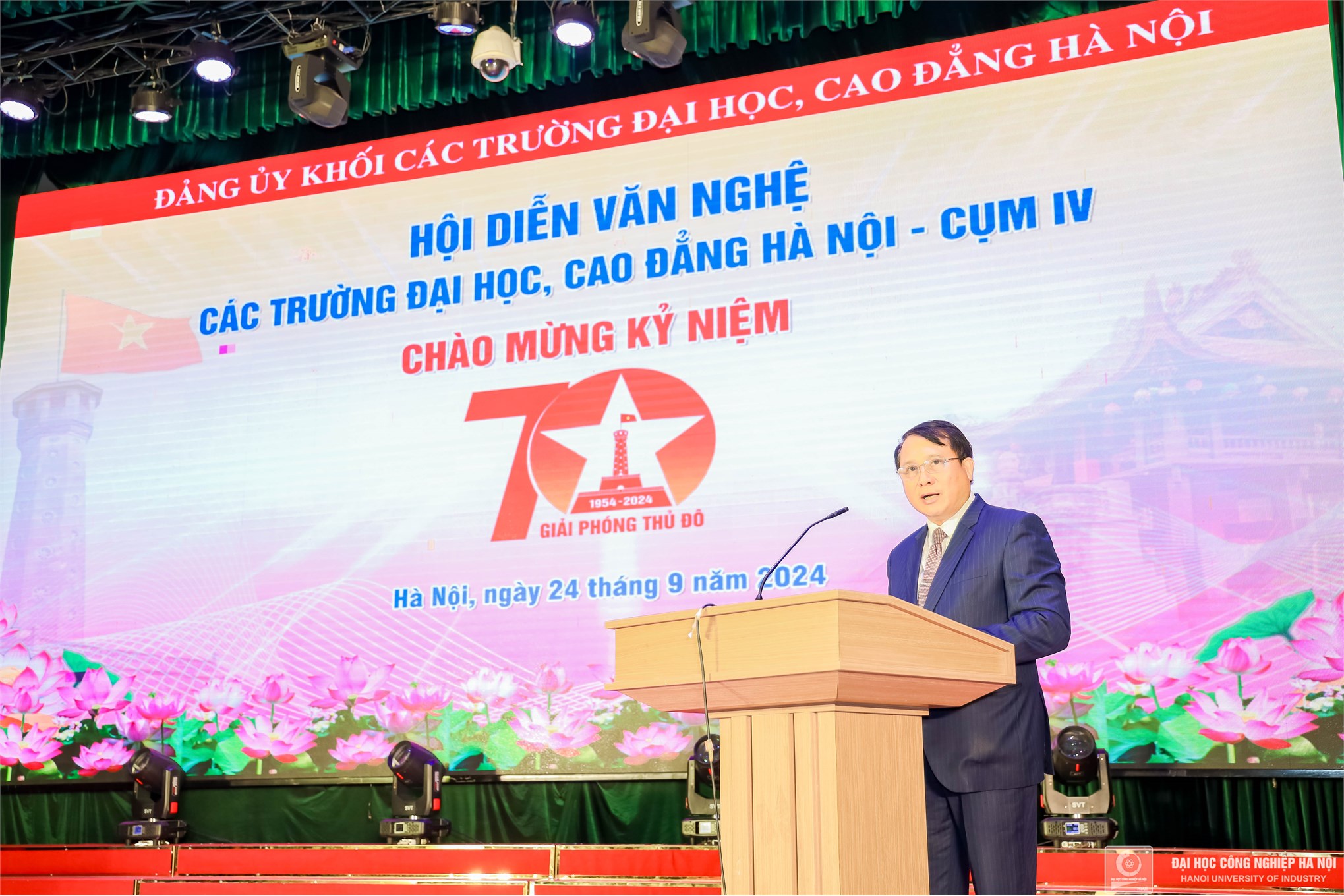 Đồng chí Lê Hồng Quân - Bí thư Đảng ủy, Chủ tịch Hội đồng Trường, Trường Đại học Công nghiệp Hà Nội, Trưởng ban tổ chức Hội diễn Cụm IV phát biểu tại Hội diễn