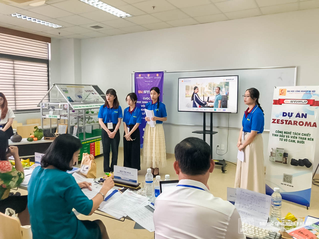 Trong phần thuyết trình của mình, đại diện nhóm nghiên cứu nhấn mạnh: ZestAroma – Hương liệu tự nhiên" là một dự án tận dụng tối đa rác thải nông nghiệp, tập trung vào việc tách sản xuất tinh dầu từ vỏ cam bưởi; Sau đó tận dụng phần rác thải sau quá trình tách tinh dầu để sản xuất viên than nén có thành phần chính từ các hợp chất tự nhiên có trong nguồn vỏ cam, bưởi.