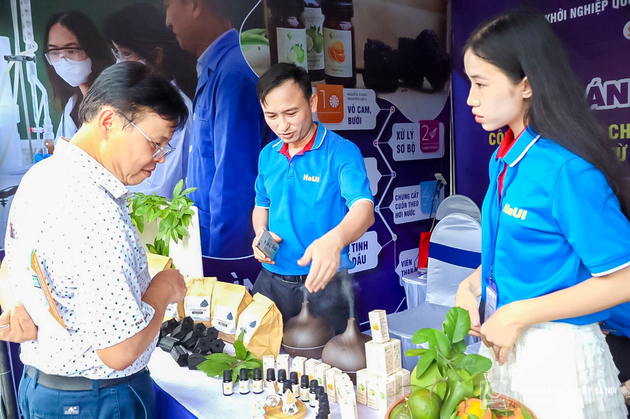 TS. Nguyễn Minh Việt – Giảng viên Khoa Công nghệ Hóa và TS.Đỗ Thị Ngọc Lan – Giảng viên Khoa Quản lý Kinh doanh, HaUI cùng với nhóm nghiên cứu tại gian hàng trưng bày sản phẩm tinh dầu bưởi và viên than nén