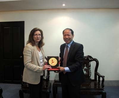 Ông Hà Xuân Quang (phải) trao quà lưu niệm cho bàChristine Louey