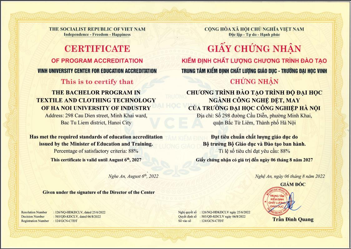 Chứng nhận kiểm định chất lượng chương trình đào tạo trình độ Đại học, ngành Công nghệ dệt may của Trường Đại học Công nghiệp Hà Nội