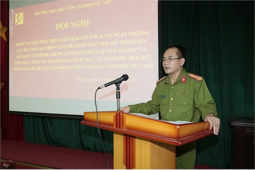 Hội nghị đã nghe Báo cáo sơ kết 03 năm triển khai thực hiện Chỉ thị số 07/CT-BCA-V28 ngày 15/8/2014 của Bộ Công an, tổng kết công tác đảm bảo an ninh trật tự năm học 2016-2017 và triển khai kế hoạch đảm bảo an ninh trật tự năm học 2017-2018. Hội nghị cũng lắng nghe 2 ý kiến tham luận hưởng ứng xây dựng, triển khai mô hình “Khu nội trú sinh viên an toàn, văn minh, không có tội phạm, tệ nạn xã hội” của Phòng Công tác HSSV và Đoàn Thanh niên; Tham luận “Tiêu chí xây dựng mô hình khu nội trú sinh viên an toàn, văn minh, không có tội phạm, tệ nạn xã hội của Trung tâm quản lý Ký túc xá – ĐHCNHN” của Trung tâm Quản lý Ký túc xá; 07 ý kiến phát biểu của đại biểu là lãnh đạo PA 83 công an TP. Hà Nội, lãnh đạo UBND, công an phường, xã trên địa bàn.