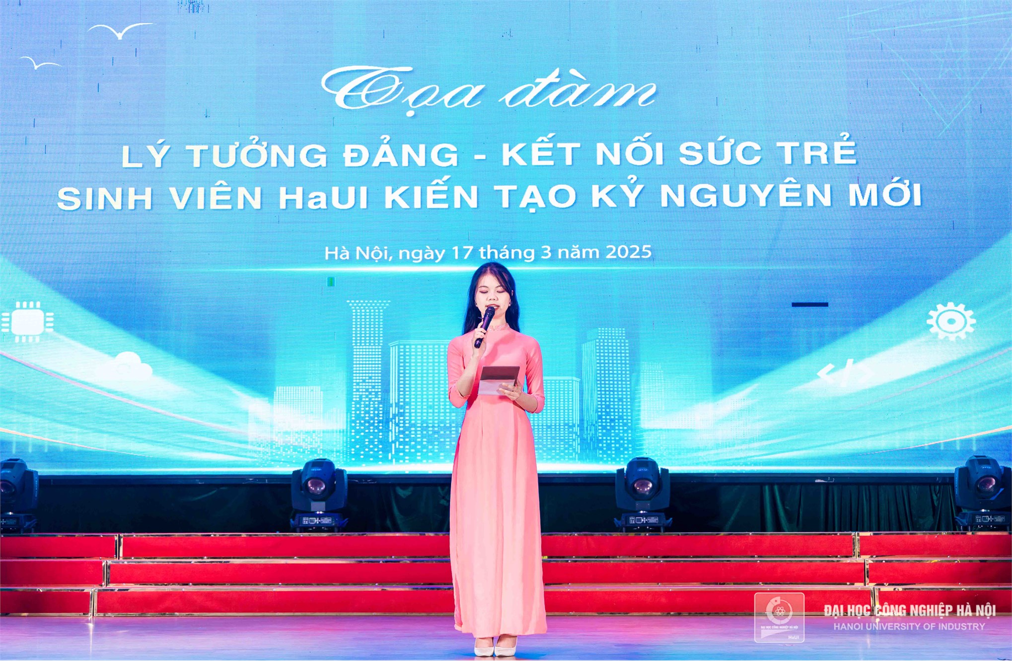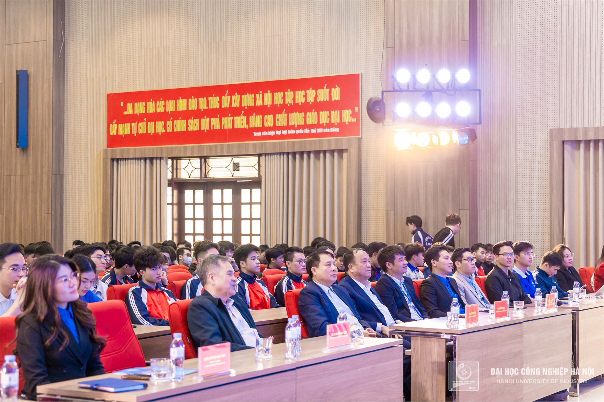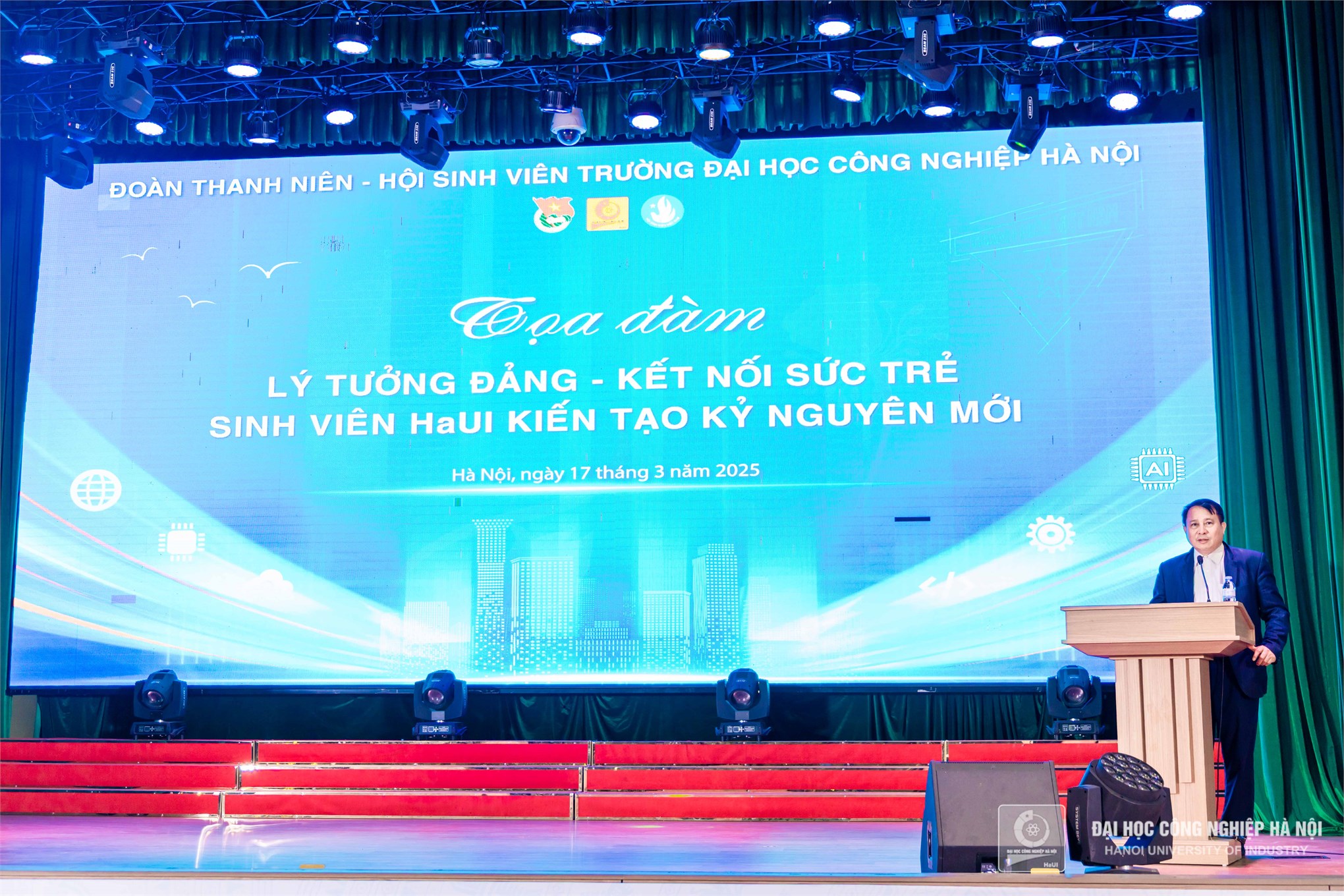 Phát biểu khai mạc, PGS.TS. Lê Hồng Quân - Bí thư Đảng ủy, Chủ tịch Hội đồng trường nhấn mạnh tầm quan trọng của lý tưởng Đảng trong việc định hướng tư duy, hành động cho thế hệ trẻ. Bước vào kỷ nguyên mới, kỷ nguyên vươn mình của dân tộc, sinh viên HaUI không chỉ là những người tiếp thu tri thức mà còn là lực lượng tiên phong, góp phần xây dựng đất nước giàu mạnh. Việc thấu hiểu và hun đúc lý tưởng cách mạng sẽ giúp các em có động lực vững vàng để phát triển bản thân và cống hiến cho xã hội.