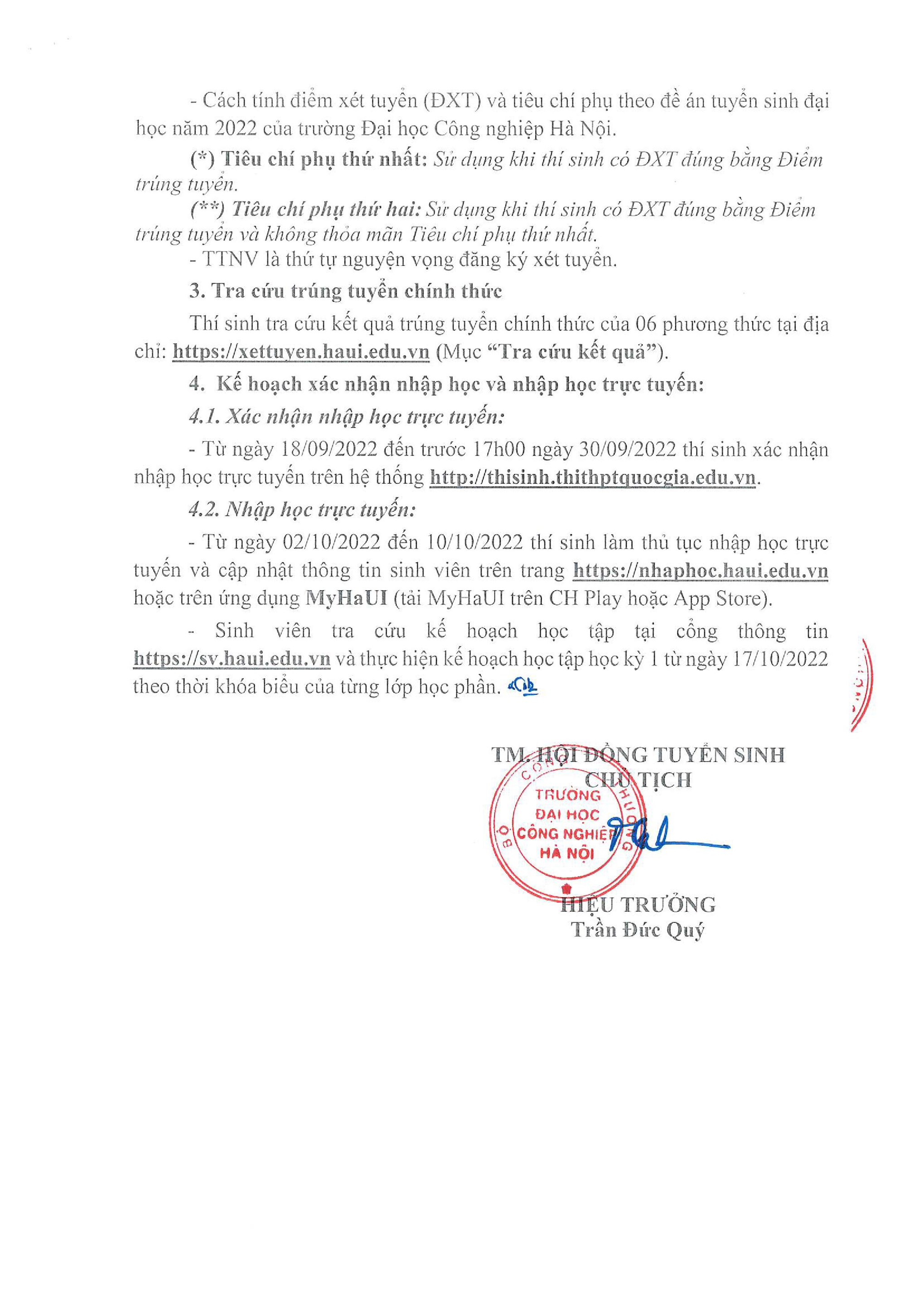 Tra cứu trúng tuyển: Từ 17h00 ngày 16/09/2022 trên trang https://xettuyen.haui.edu.vn. Từ ngày 18/09 đến 30/09/2022, thí sinh trúng tuyển cần xác nhận nhập học trên trang http://thisinh.thithptquocgia.edu.vn của BGD&ĐT, sau đó thí sinh nhập học trực tuyến trên trang https://nhaphoc.haui.edu.vn để chính thức trở thành tân sinh viên Trường Đại học Công nghiệp Hà Nội.