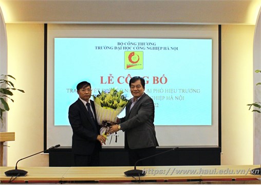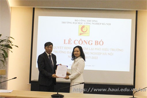 Thừa ủy quyền của lãnh đạo Bộ Công Thương, Phó Vụ trưởng Vụ tổ chức cán bộ Nguyễn Thị Lâm Giang trao Quyết định của Bộ trưởng Bộ Công Thương bổ nhiệm lại PGS.TS. Phạm Văn Bổng giữ chức vụ Phó Hiệu trưởng trường Đại học Công nghiệp Hà Nội nhiệm kỳ 2017 – 2022.