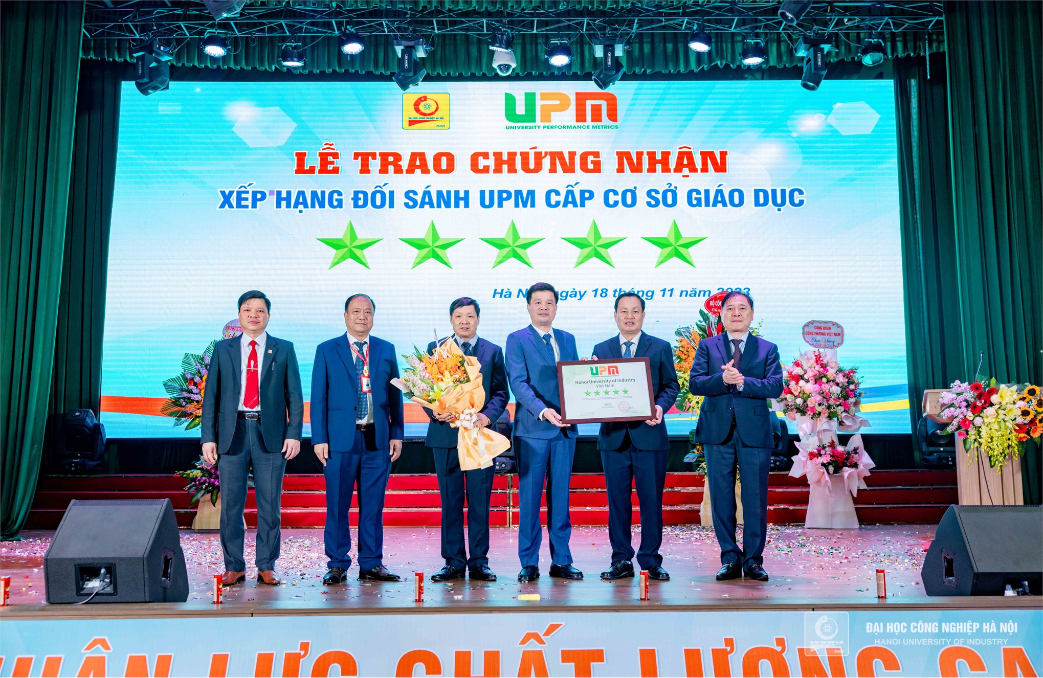 GS.TS.Nguyễn Hữu Đức - Nguyên Phó Giám đốc Đại học Quốc gia Hà Nội, Chủ tịch sáng lập hệ thống xếp hạng đối sánh UPM và đồng chí Phan Xuân Dũng, Nguyên Uỷ viên Trung ương Đảng, Nguyên Chủ nhiệm Uỷ ban Khoa học, Công nghệ và Môi trường của Quốc hội, Chủ tịch Liên hiệp các Hội Khoa học Kỹ thuật Việt Nam trao chứng nhận và tặng hoa chúc mừng Đại học Công nghiệp Hà Nội