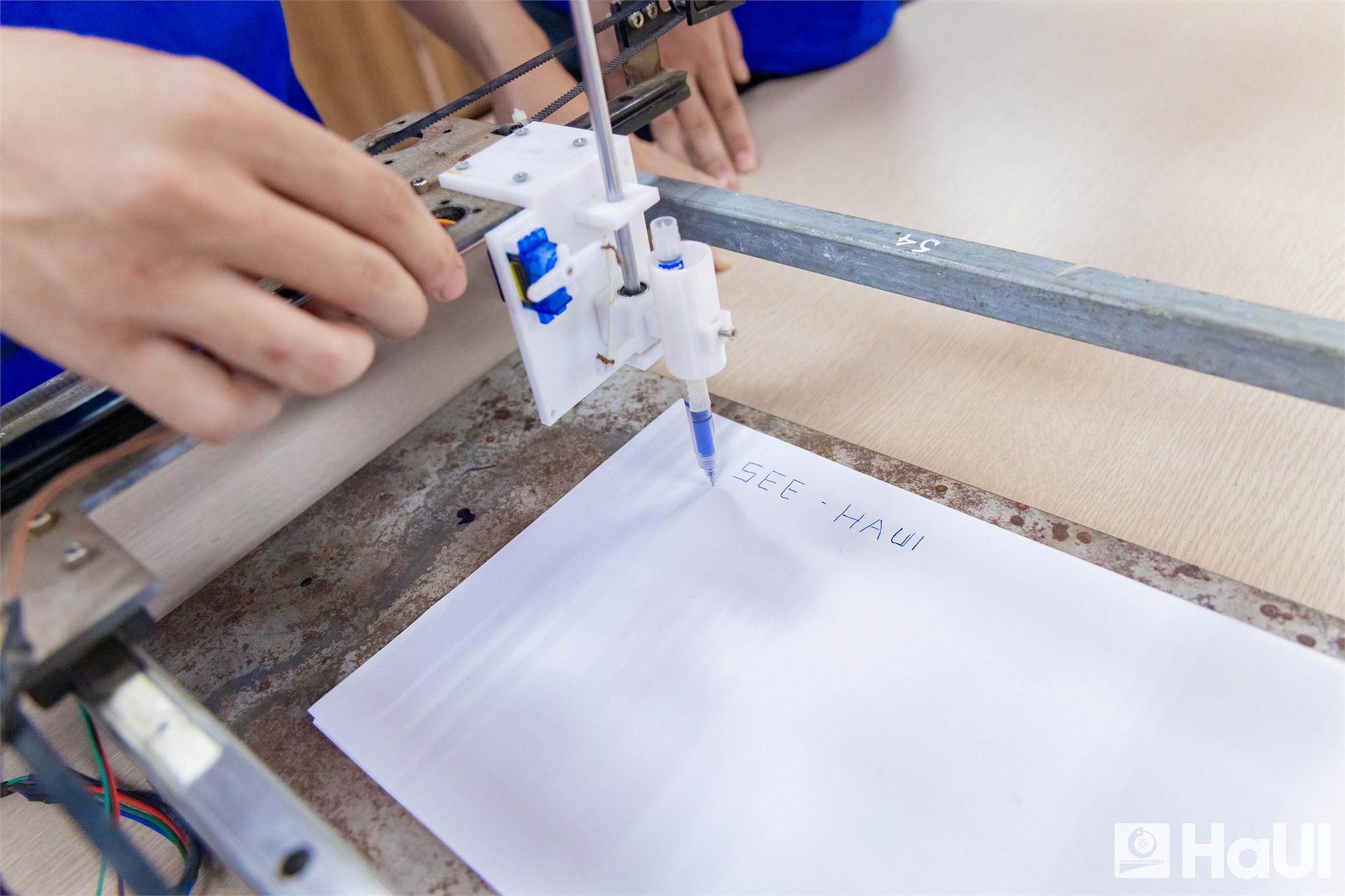 Nhắc lại hành trình thực hiện đề tài, kỷ niệm đáng nhớ nhất với nhóm chính là khoảnh khắc chiếc bút máy đầu tiên hoàn thiện nét chữ trên mô hình.