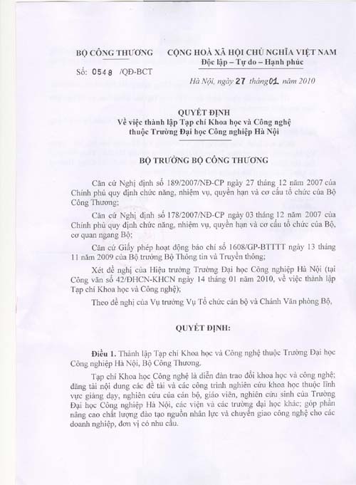 Căn cứ vào giấy phép hoạt động báo chí của Bộ Thông tin và Truyền thông, ngày 27 tháng 01 năm 2010, Bộ Công Thương đã ban hành Quyết định số 0548/QĐ-BCT về việc thành lập Tạp chí Khoa học và Công nghệ thuộc Trường Đại học Công nghiệp Hà Nội.